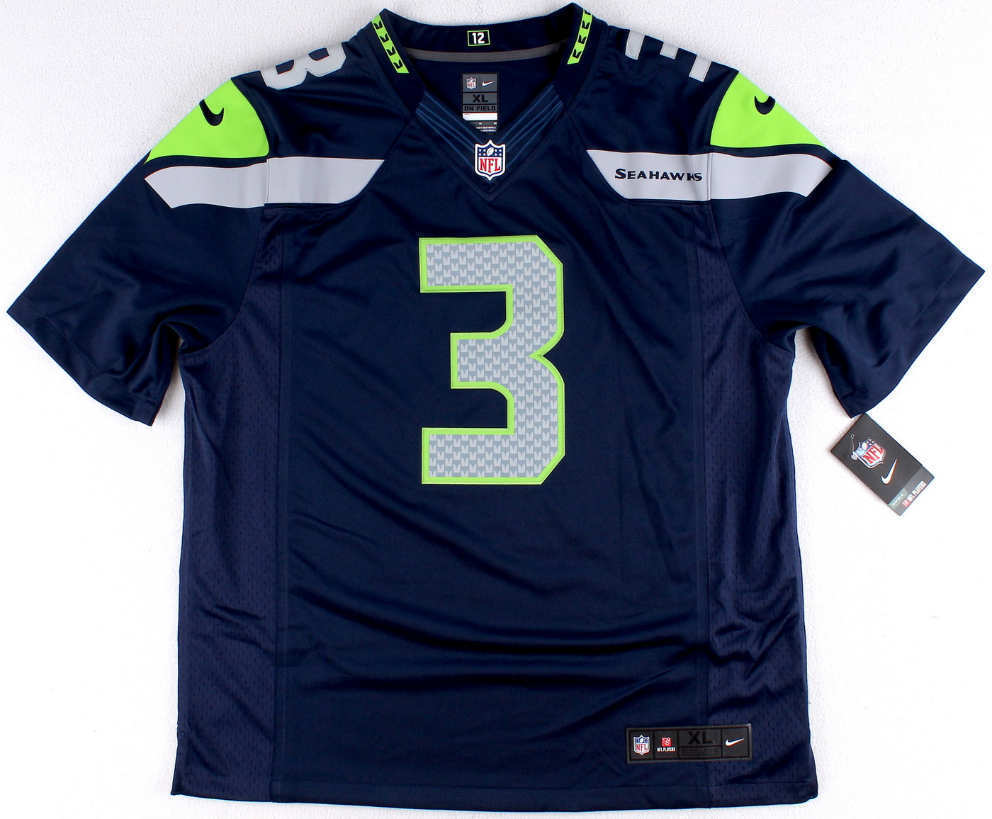Nike jersey, size XL. Jersey is new with tags. Hand-signed in black felt tip pen by Russell Wilson. The autograph includes an official Russell Wilson hologram and matching COA from Mill Creek Sports for authenticity purposes.