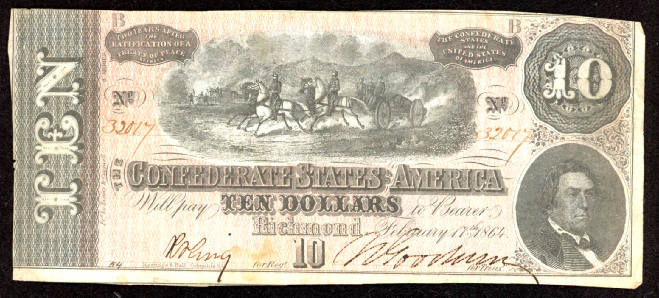 After the Civil War broke out in 1861, the newly established Confederate government began to issue it's own money as legal tender to the citizens of the South. The gamble was that if the South won the war, the money would be redeemable. The 1st note from the Government of the Confederate States of America was issued in April of 1861. From then on, notes were issued on through 1864. Almost every Confederate note was painstakingly hand signed and numbered. It is not uncommon for these notes to have uneven, or rough borders since scissors or shears were used to hastily cut the sheets of notes apart.