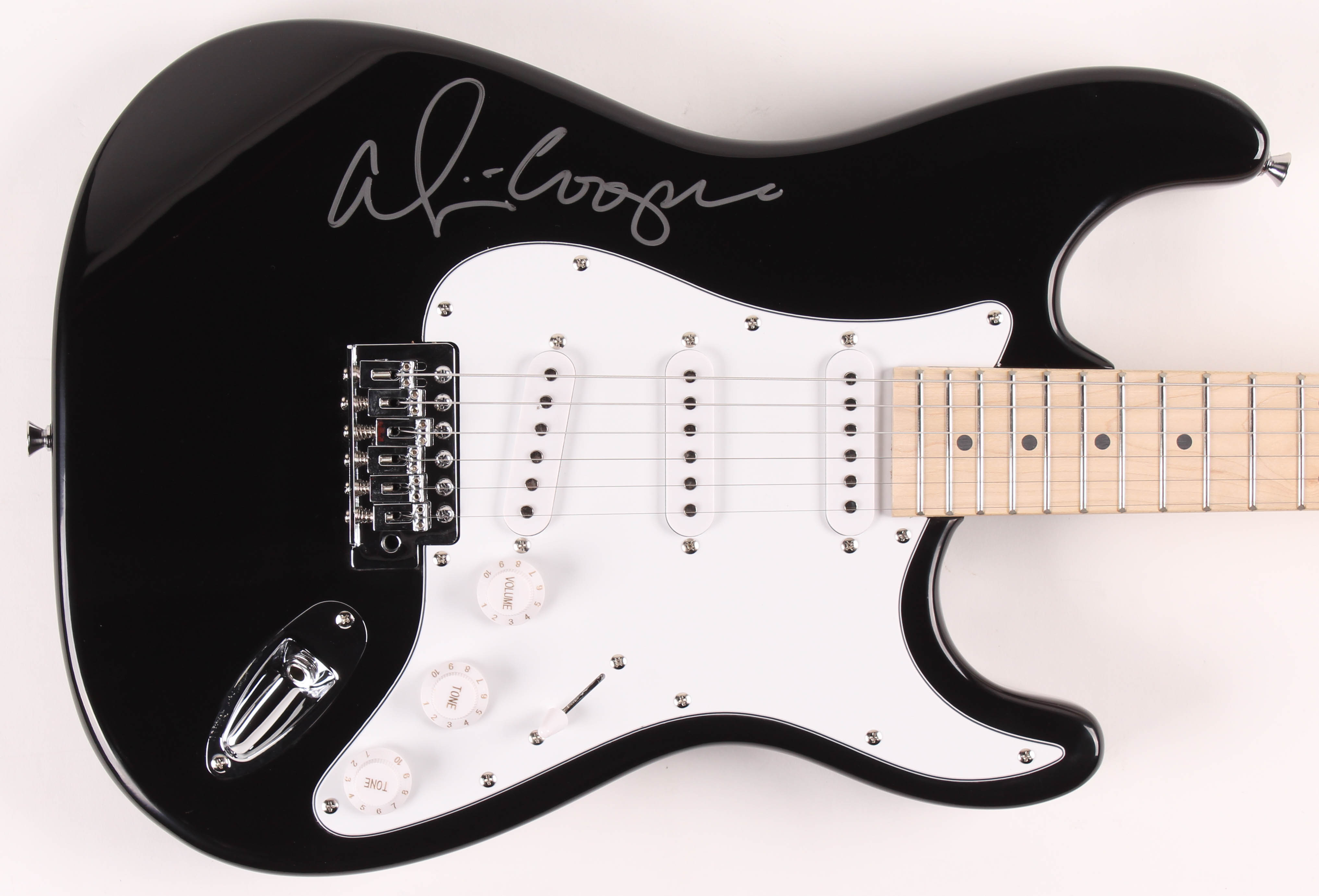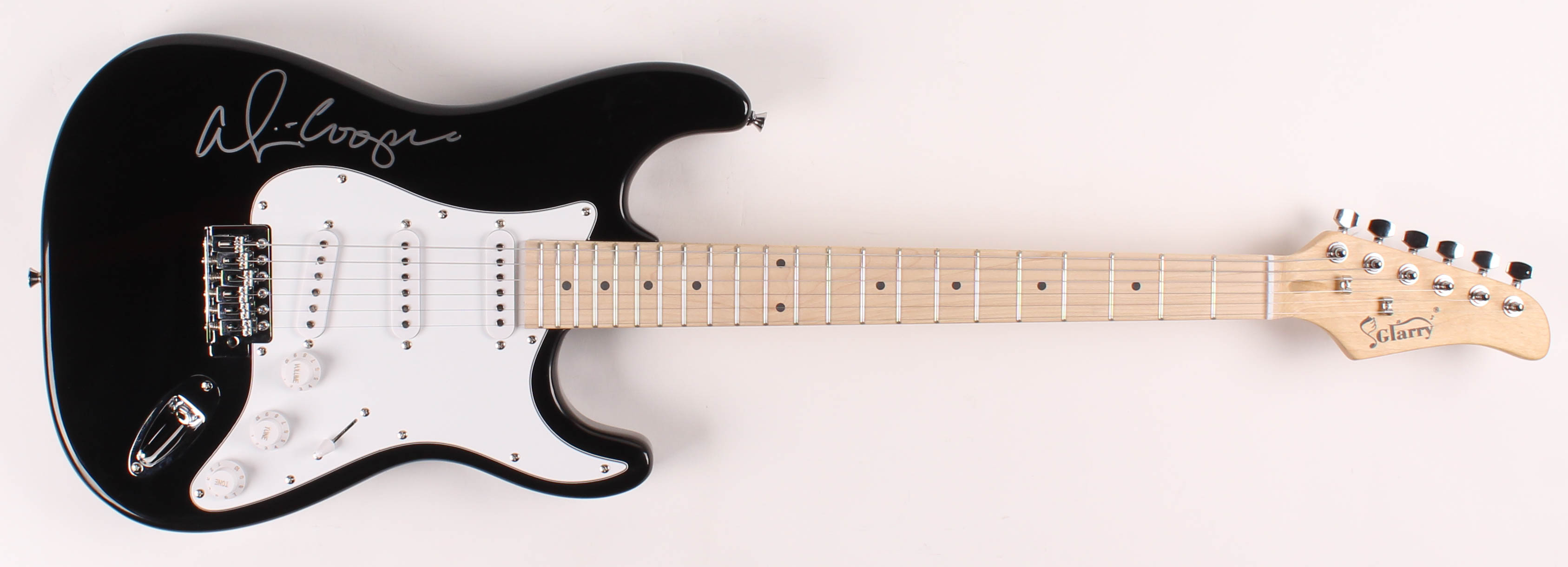 Glarry full-size electric guitar measures approximately 39" in length and is hand-signed on the body by Alice Cooper.