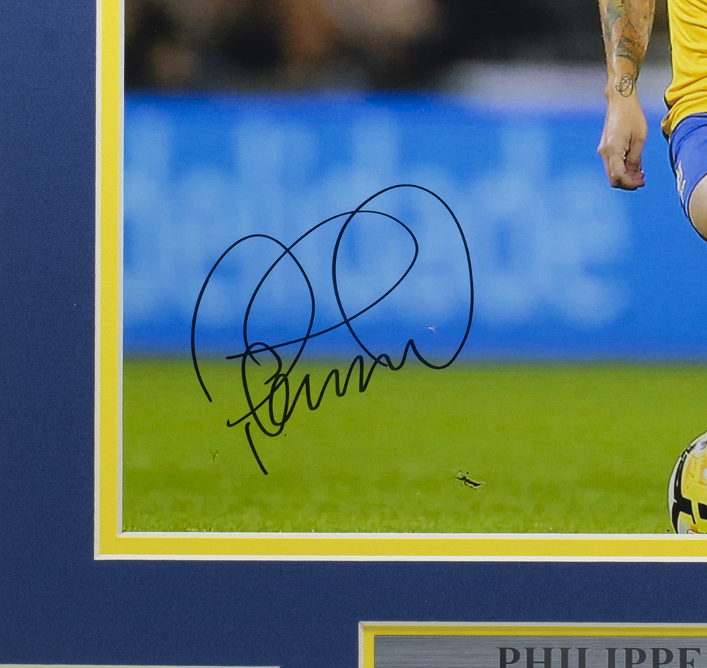 Custom frame measures 16" x 20" in size and has been hand-signed by Philippe Coutinho (Brazil National Team).