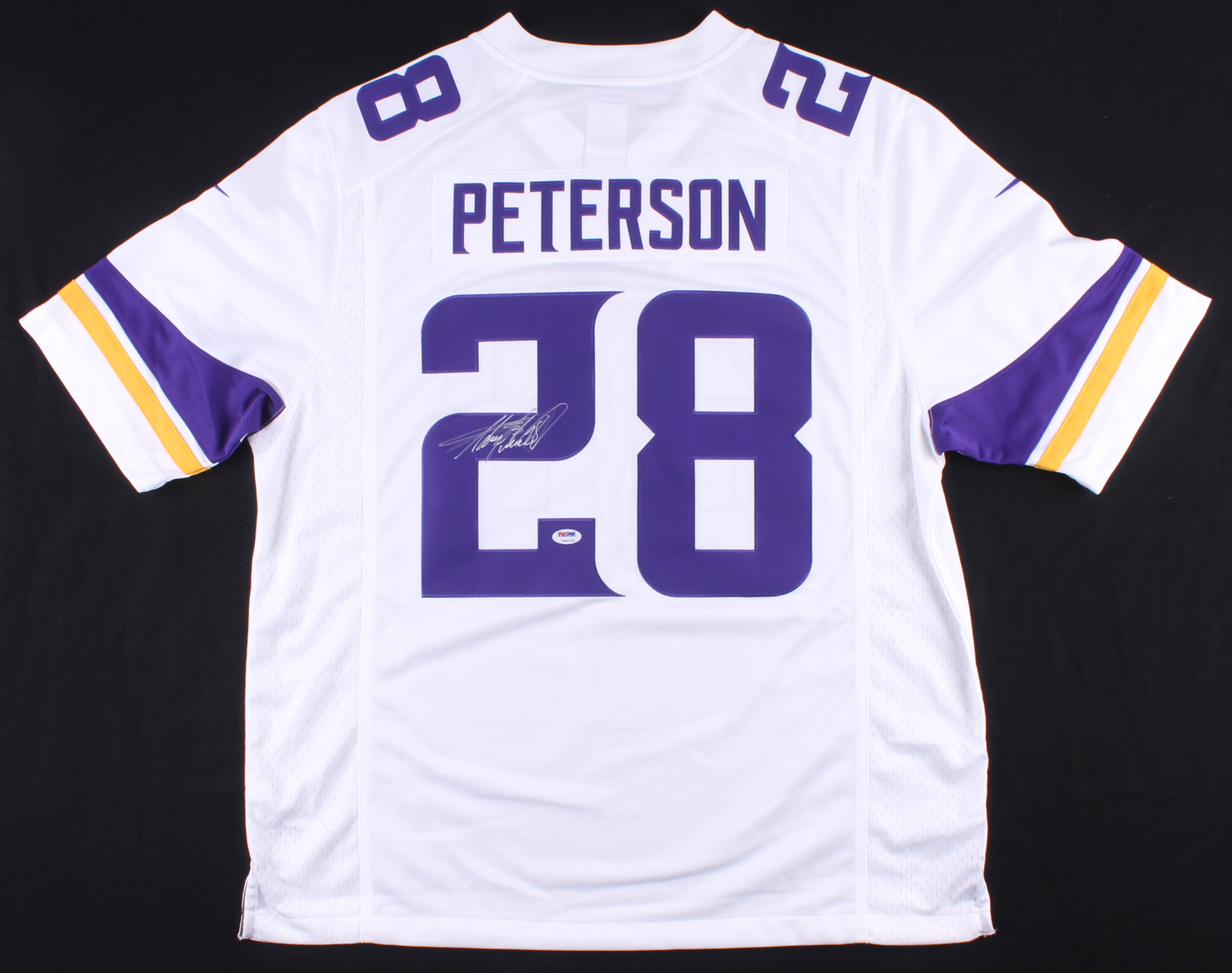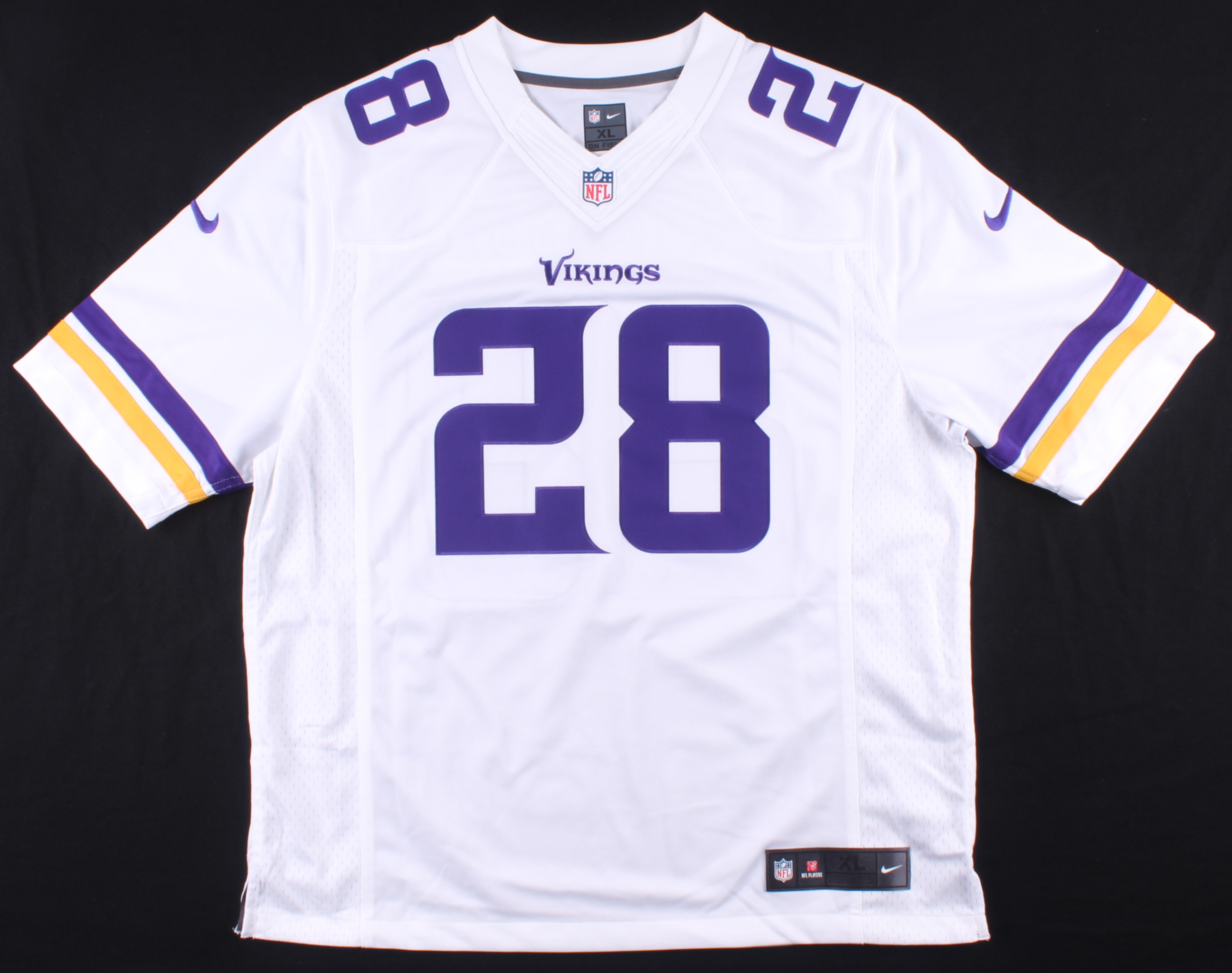 Nike on-field style jersey. Everything sewn on, size XL. Hand-signed by Adrian Peterson (Minnesota Vikings).