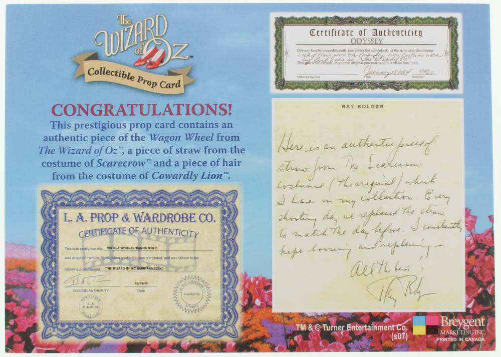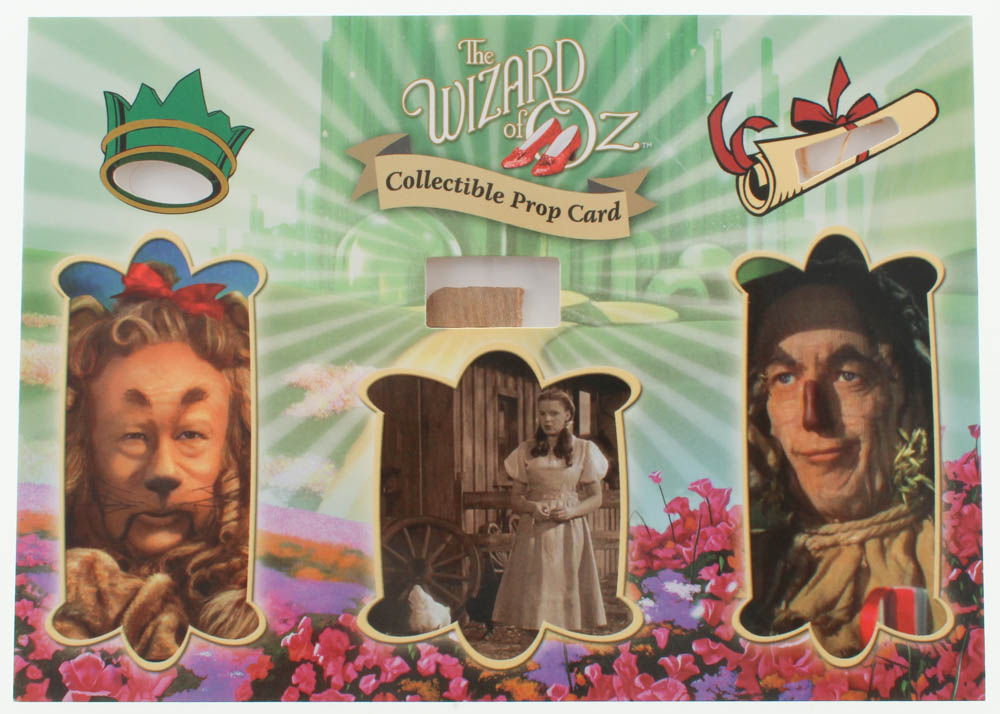"Wizard of Oz" Prop Card Display With Piece of Wagon Wheel, Straw From Scarecrow & Hair From Lion (Odyssey COA)