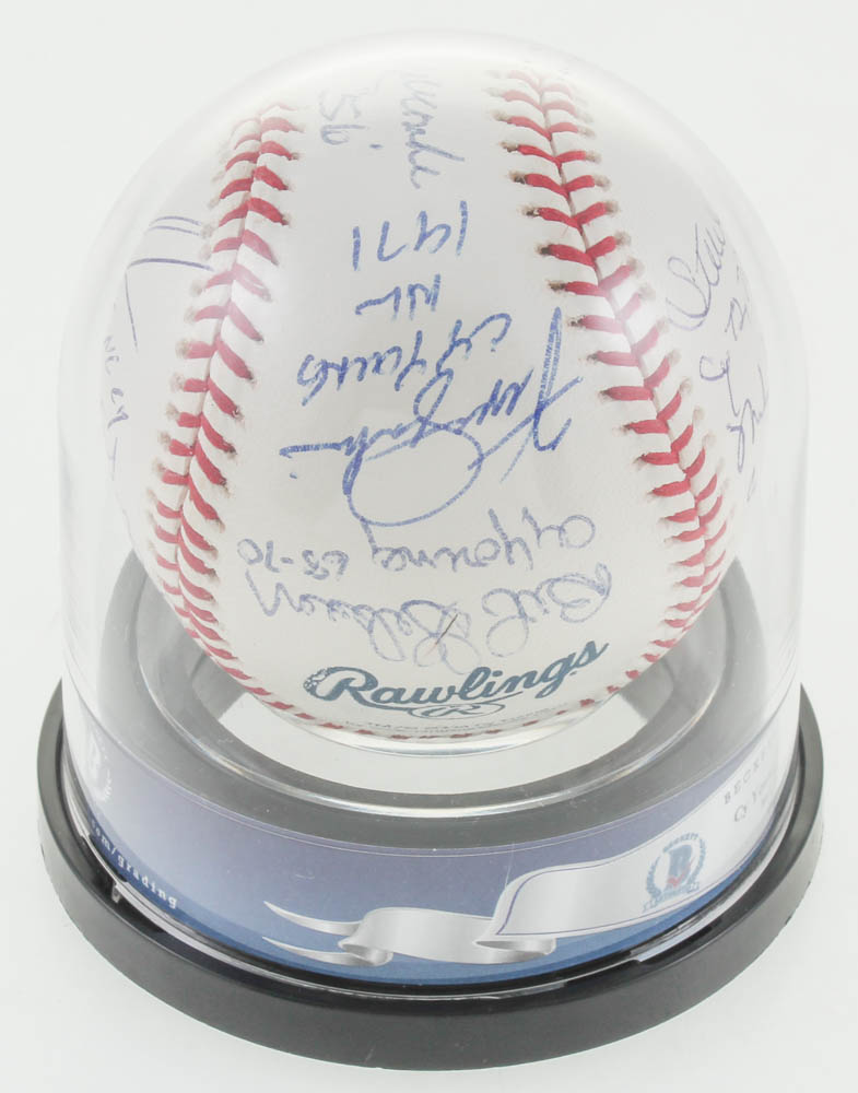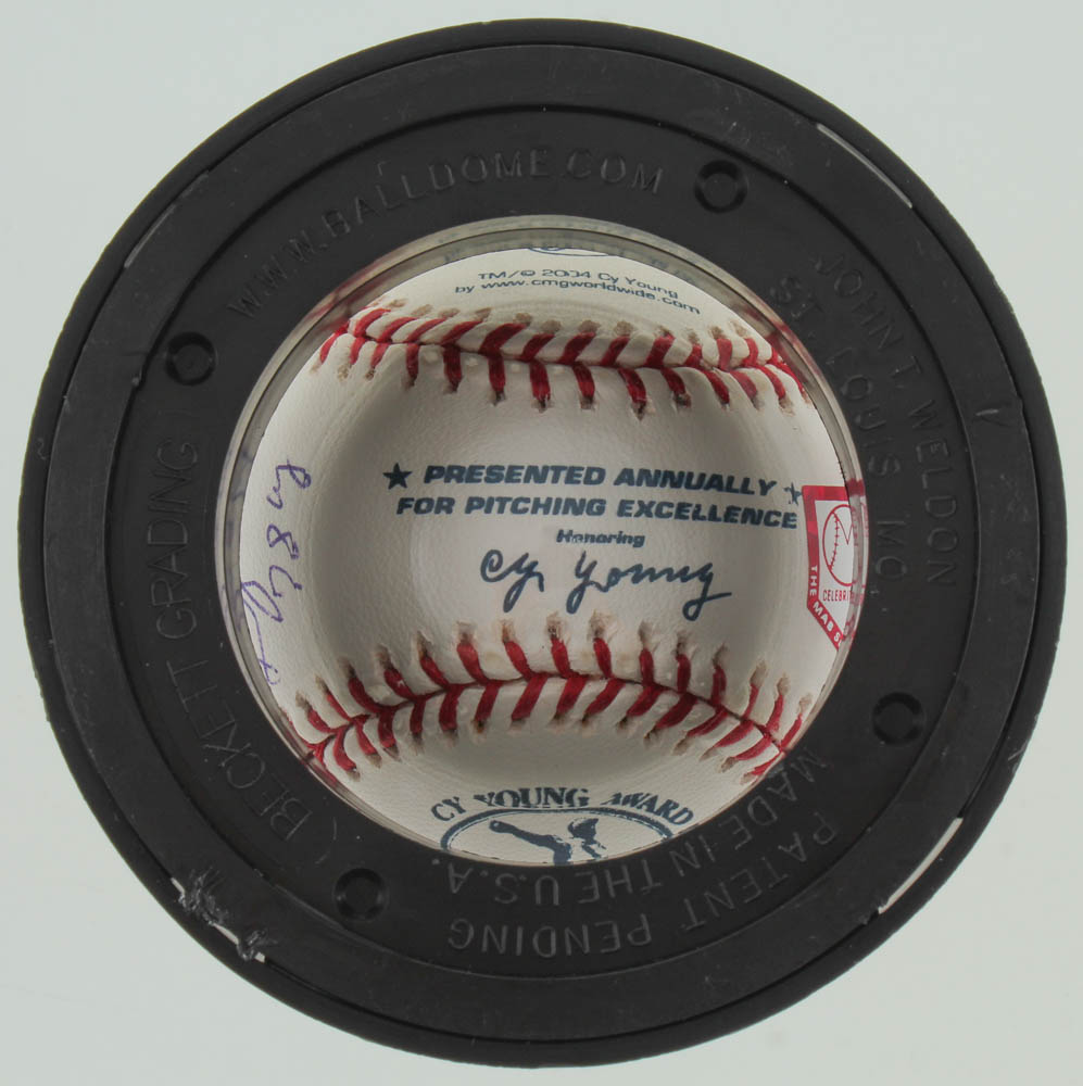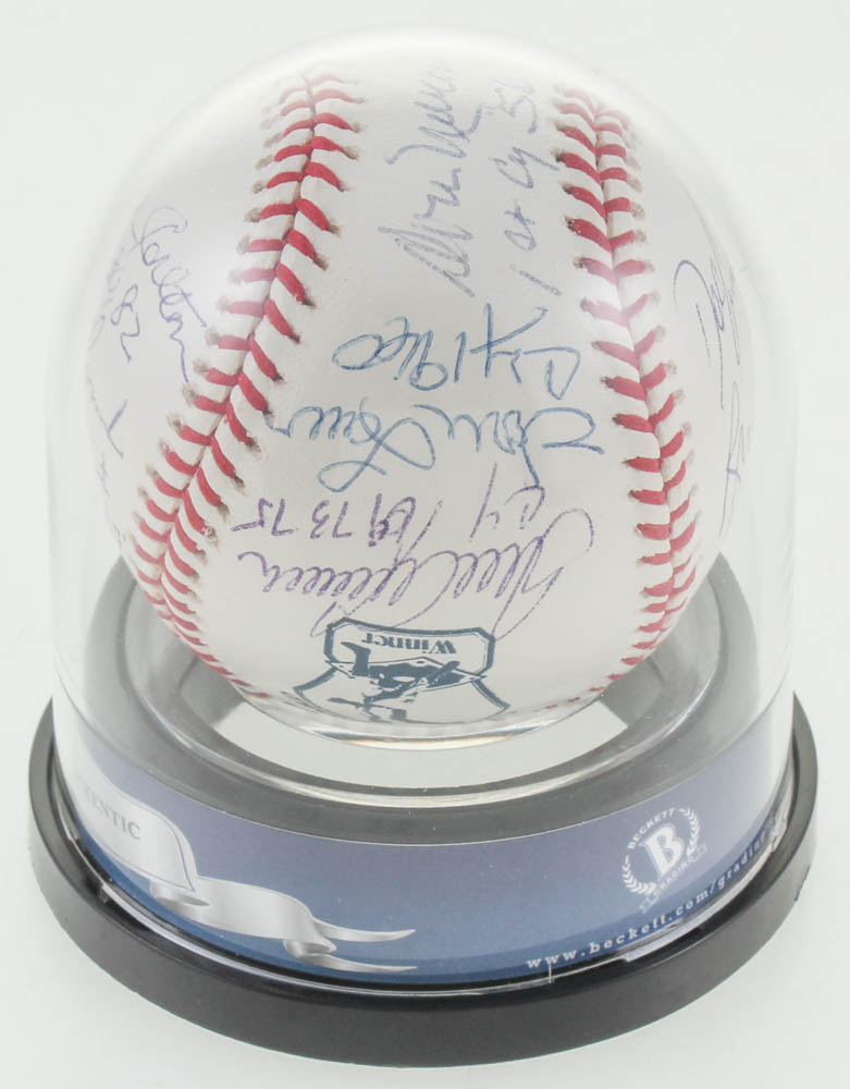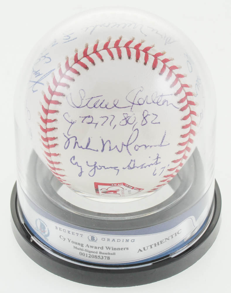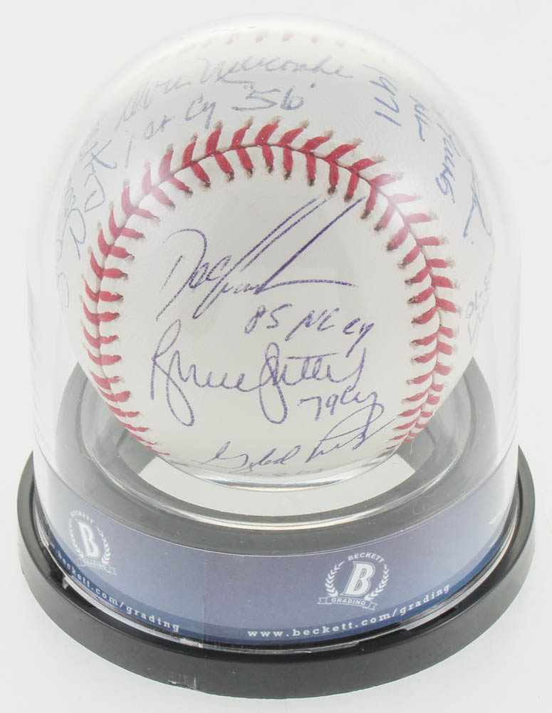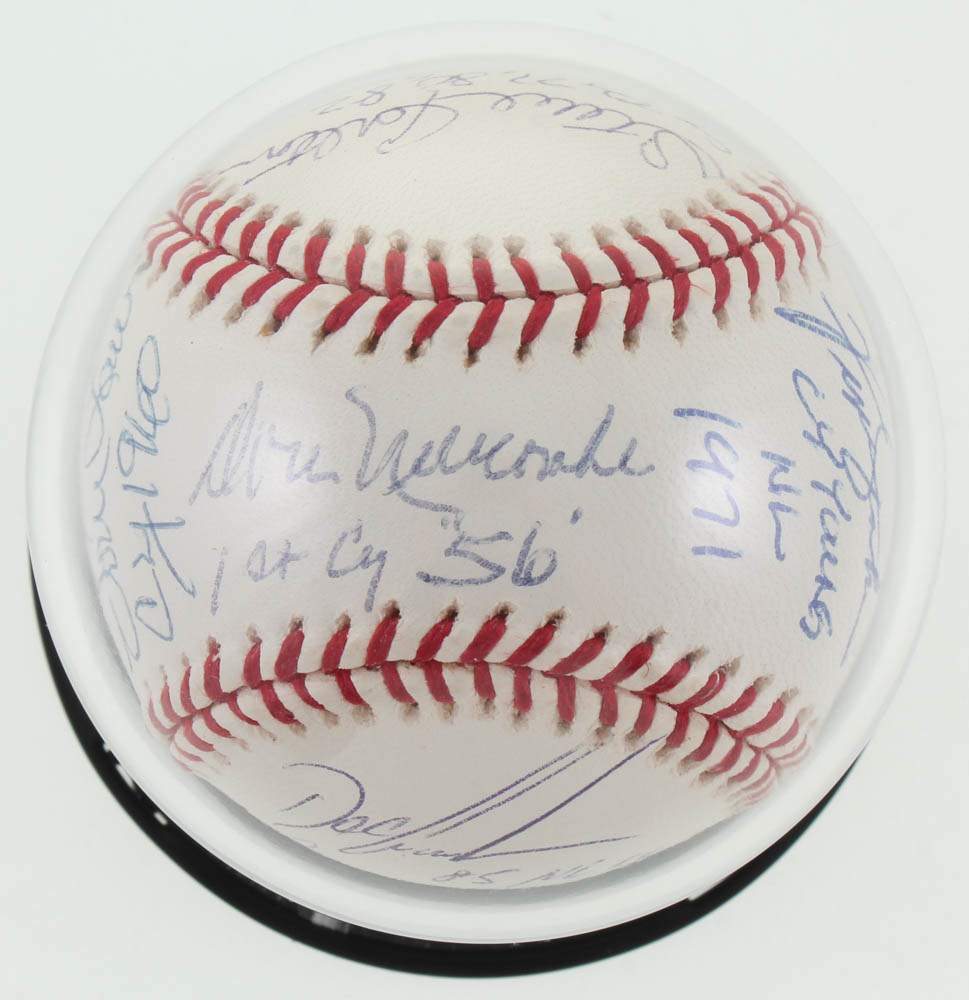 Rawlings Cy Young Logo Baseball Signed by (10) with Dwight "Doc" Gooden (New York Mets), Tom Seaver (New York Mets, HOF), Bob Gibson (St. Louis Cardinals, HOF), Steve Carlton (Philadelphia Phillies, HOF), Vern Law (Pittsburgh Pirates), Don Newcombe (D. 2019, Brooklyn Dodgers), Fergie Jenkins (Chicago Cubs, HOF), Mike McCormick (D. 2020, San Francisco Giants), Gaylord Perry (San Francisco Giants, HOF), and Bruce Sutter (Chicago Cubs, HOF).