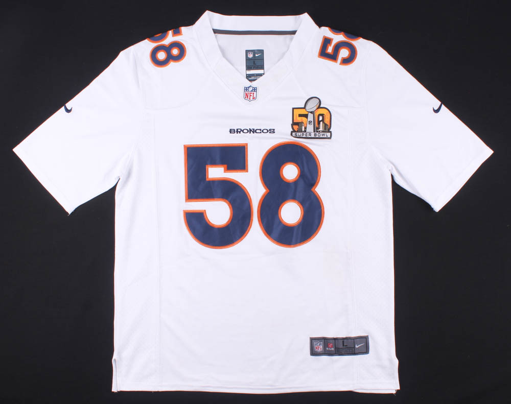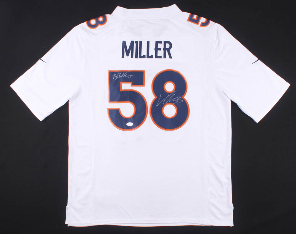 Nike Super Bowl 50 on-field style jersey. Everything is sewn on, size L. Has been hand-signed by Bradley Chubb and Von Miller. (Denver Broncos)