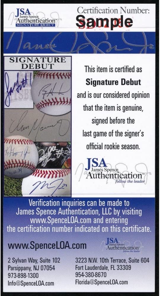 The autograph(s) includes an official James Spence Authentication (JSA) "Signature Debut" hologram and COA. "Signature Debut" is the autographed memorabilia equivalent to a rookie card. The JSA definition of a "Signature Debut" is as follows: "Any item that is autographed and received by JSA prior to the last game of the signer's official rookie season.