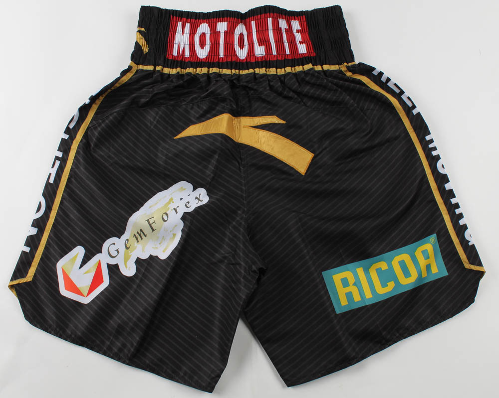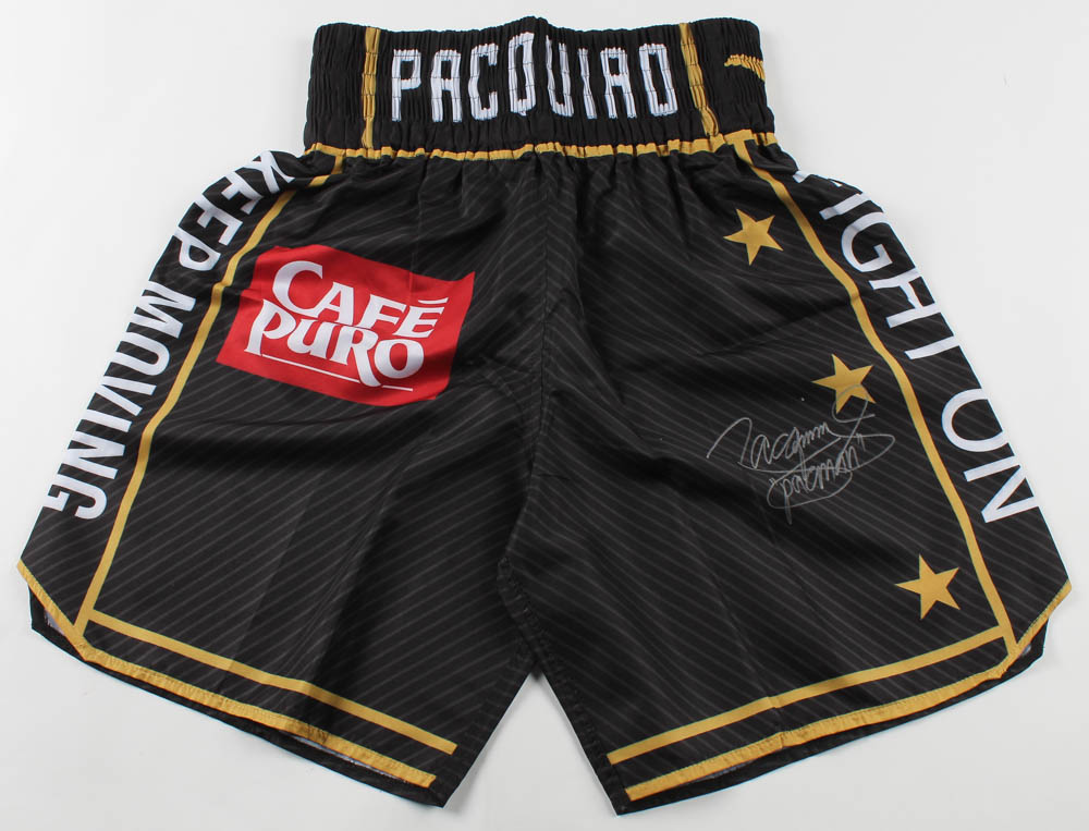Manny Pacquiao fight model boxing shorts, size M. Hand-signed and inscribed by Manny Pacquiao.