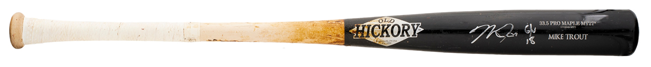 Old Hickory Pro Maple MT27 player model baseball bat. Hand-signed and inscribed by Mike Trout (Los Angeles Angels). This baseball bat was game-used by Mike Trout during his 2018 season. The bat is uncracked.