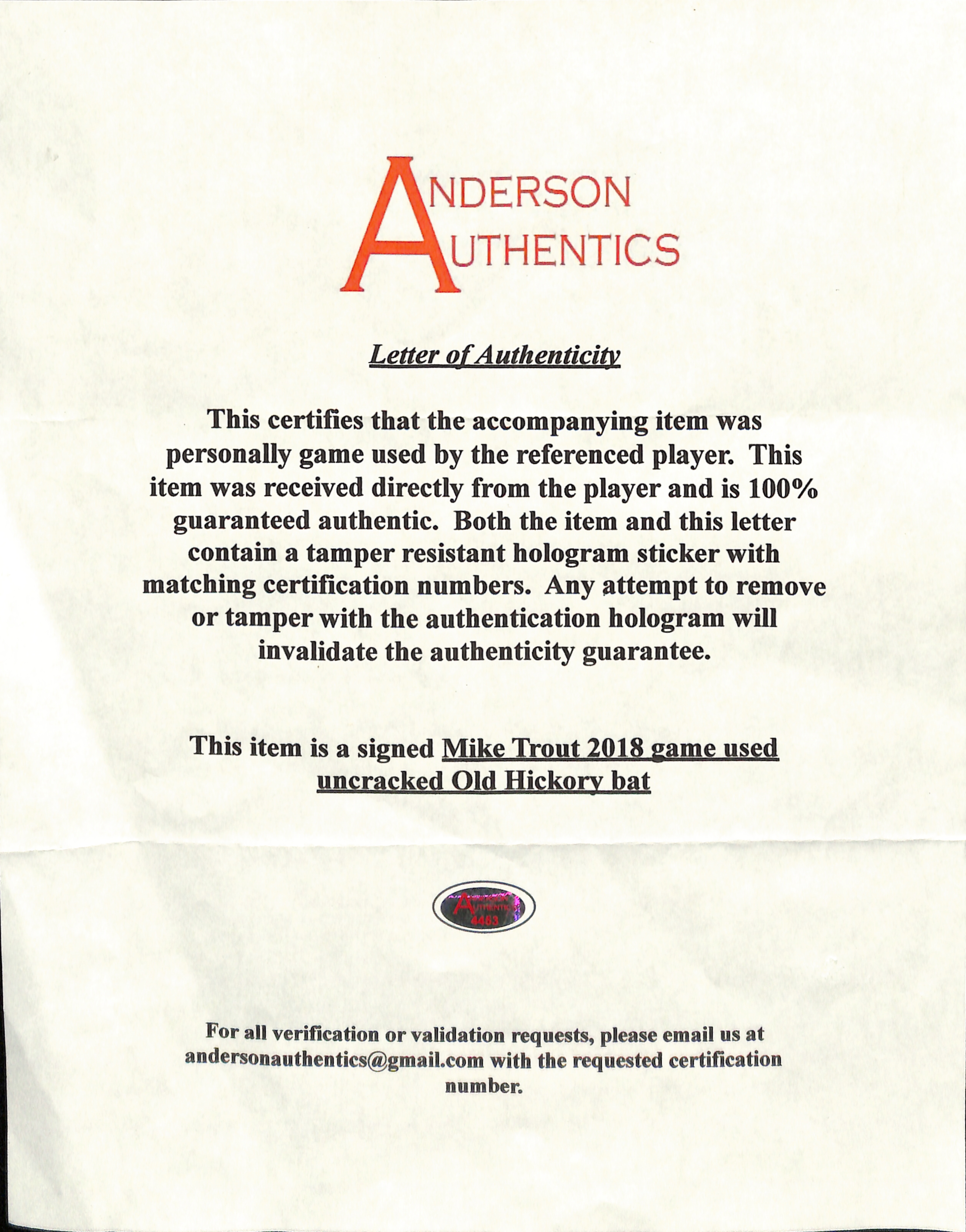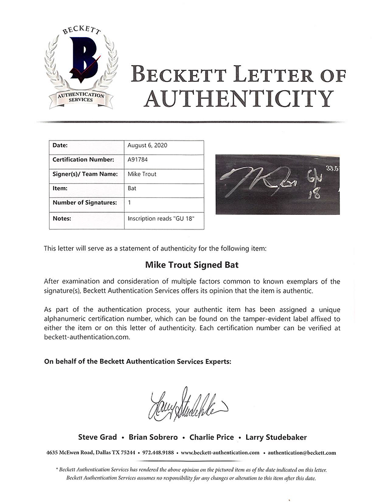 The bat includes an official Anderson Authentics hologram and matching LOA as well as an official Beckett Authentication Services hologram and matching LOA for authenticity purposes. Authentication: Anderson Authentics LOA & Beckett LOA