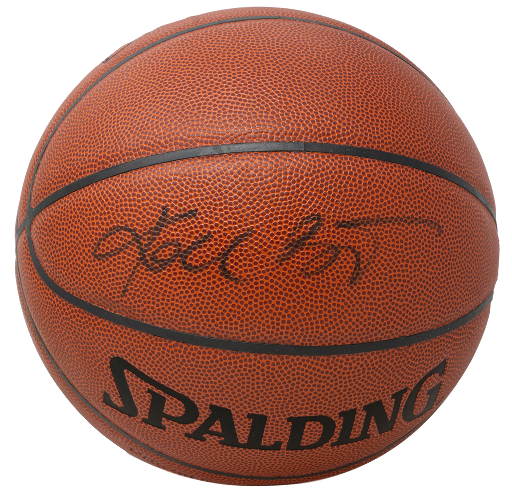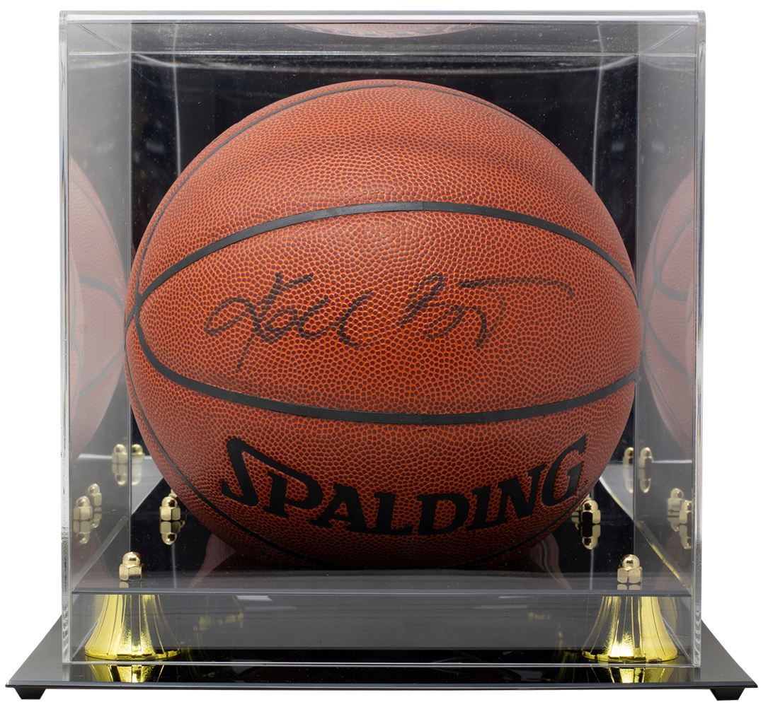 Spalding indoor/outdoor NBA basketball. The ball has been hand-signed by Kobe Bryant (D. 2020, Los Angeles Lakers, HOF). Includes display case shown.