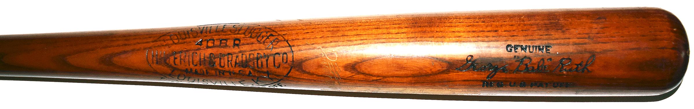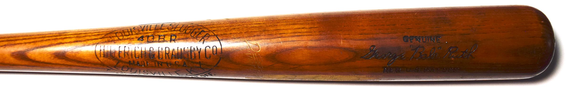 This Louisville Slugger vintage bat measures 33" in length and is a Babe Ruth store model with a pleasing antique patina and feel. The bat is hand-signed by Babe Ruth on the barrell, with wear over the signature from display at one time.