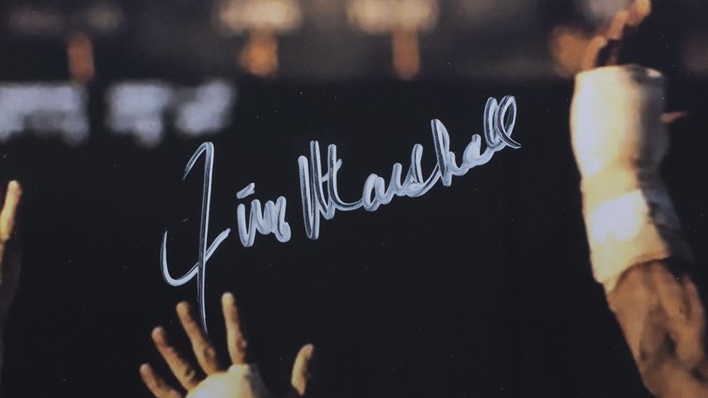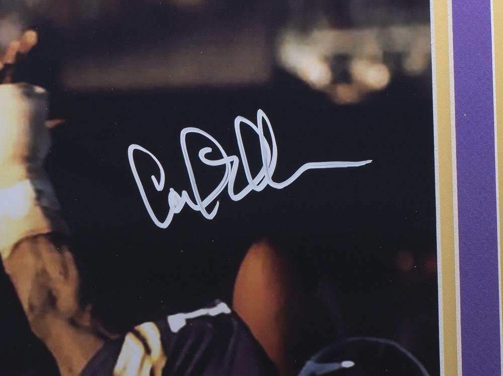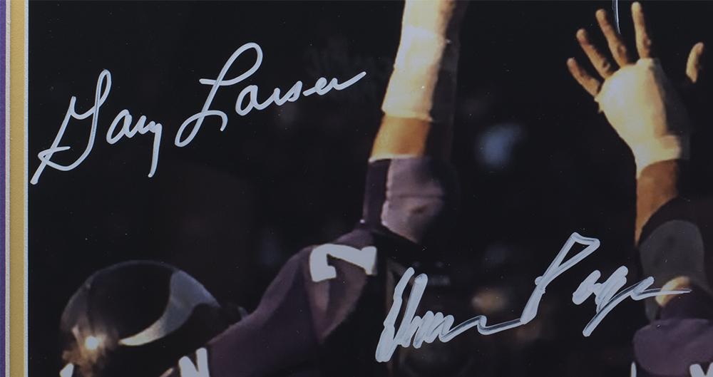 Custom framed photo display measures 22" x 27" in size and features a 16" x 20" photo that has been hand-signed by Carl Eller, Jim Marshall, Gary Larsen, and Alan Pag.