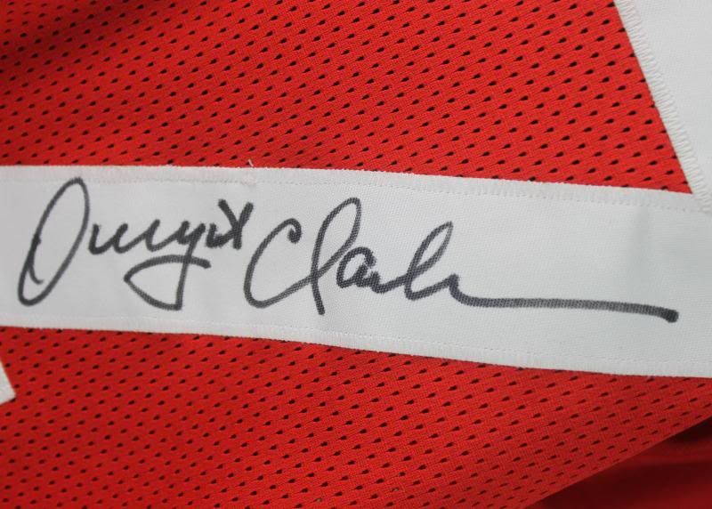 Custom on-field style jersey. Everything is sewn on, size XL. Hand-signed by Dwight Clark (D. 2018). The jersey includes a hand-drawn play.