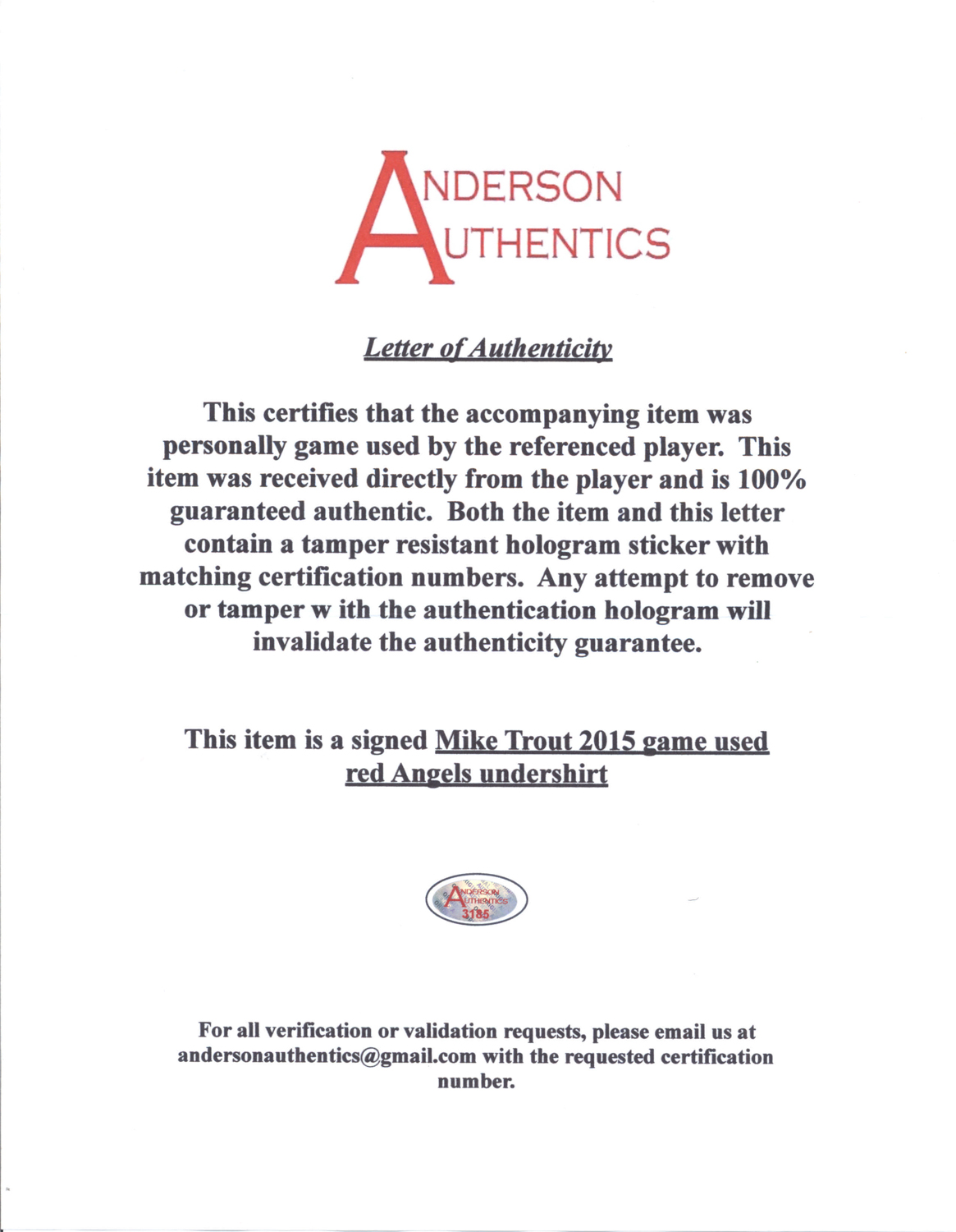 This game worn/used swatch comes from a 2018 ANAHEIM ANGELS shirt worn by Mike Trout Authenticated by Anderson Authentics. Game worn swatches have NEVER been offered to the public in this format. Check out what you might find!