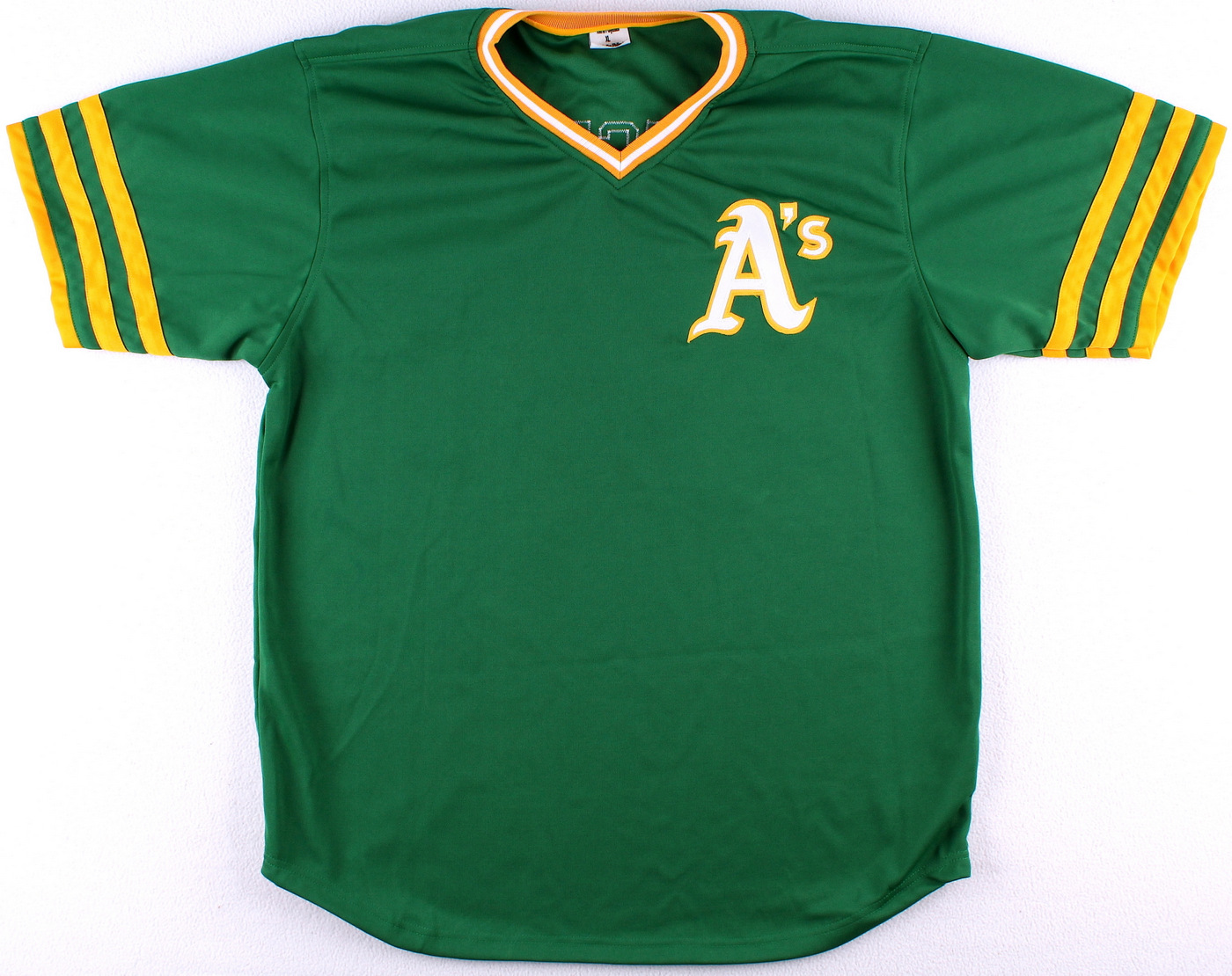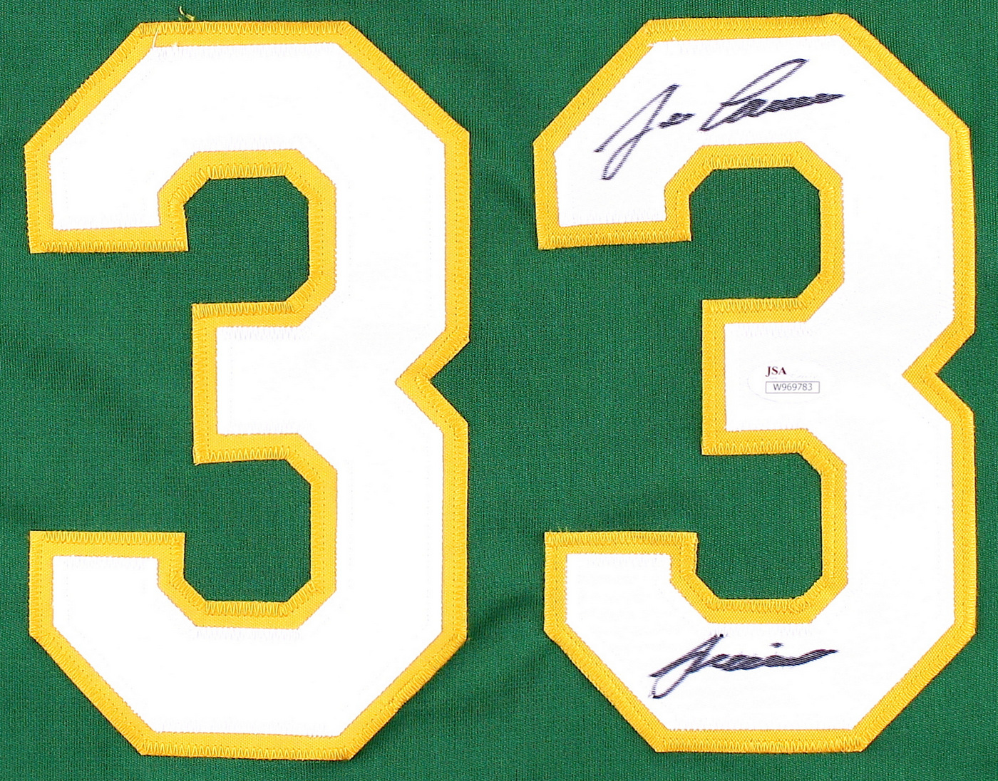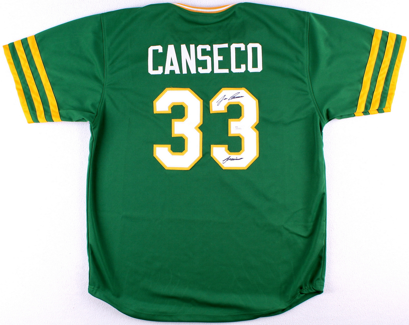 Custom on-field style jersey. Everything sewn on, size XL. Hand-signed and inscribed in black felt tip pen by Jose Canseco. The autograph includes an official James Spence Authentication (JSA) hologram and matching COA for authenticity purposes. The signing of this item was witnessed by JSA.