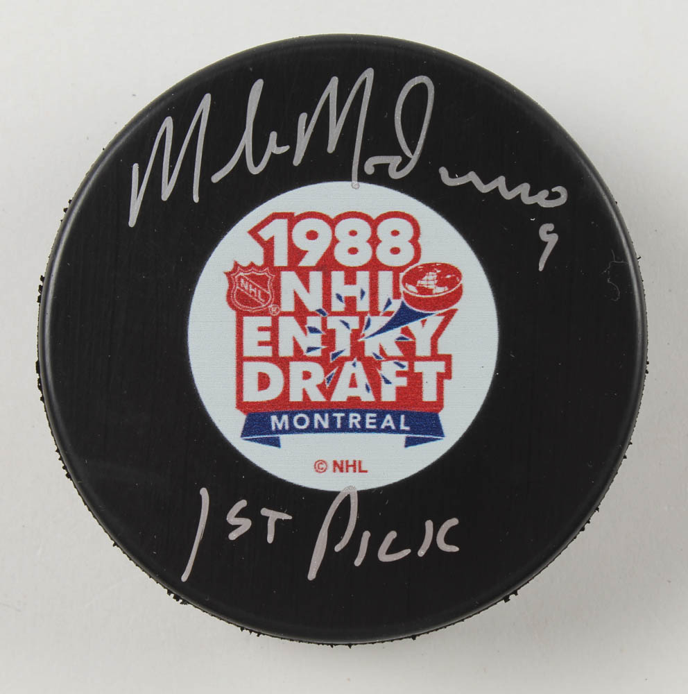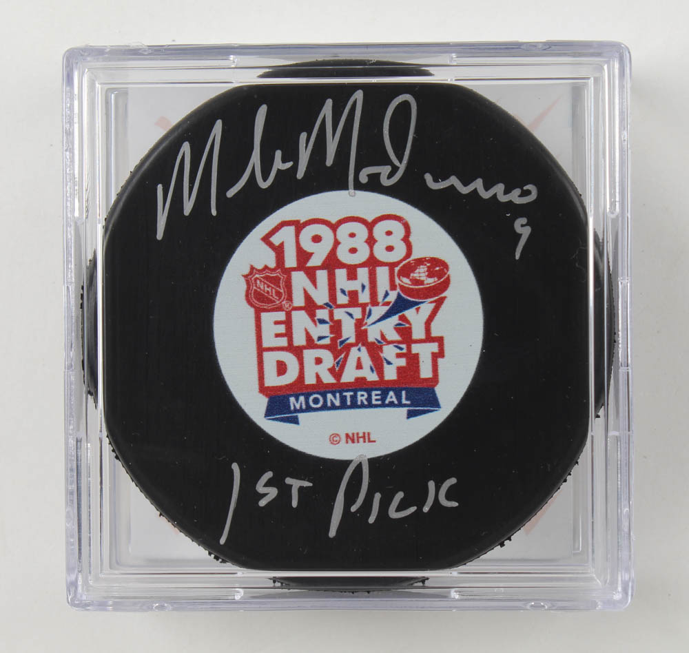 Mike Modano Signed 1988 NHL Draft Logo Hockey Puck Inscribed "1st Pick" with Display Case (Beckett COA)