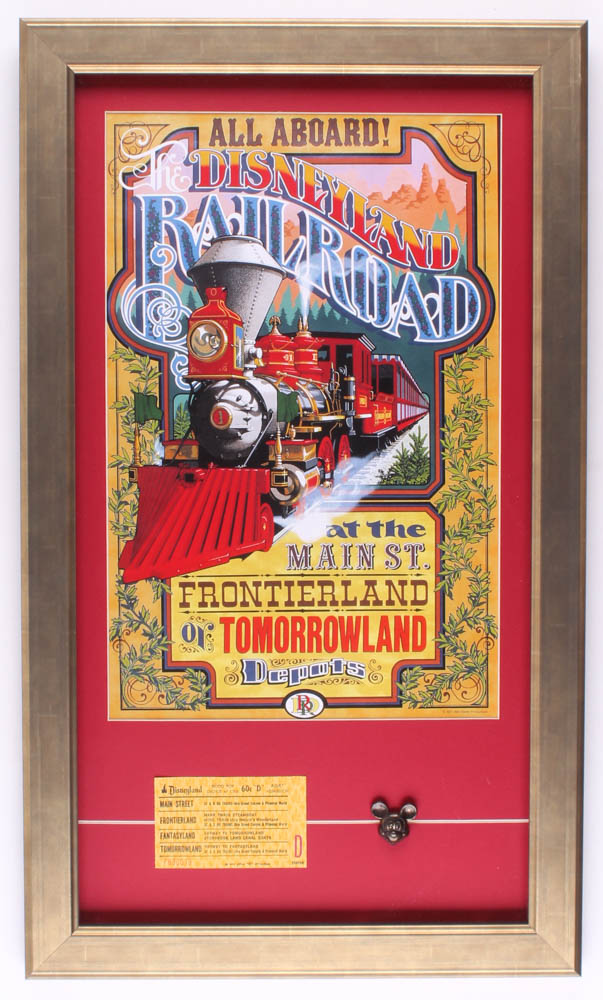Disneyland Railroad 15.5x26.5 Custom Framed Poster Print Display with Disneyland "Mickey Mouse" Bronze Pin & Vintage 1960's "D" Train Ticket