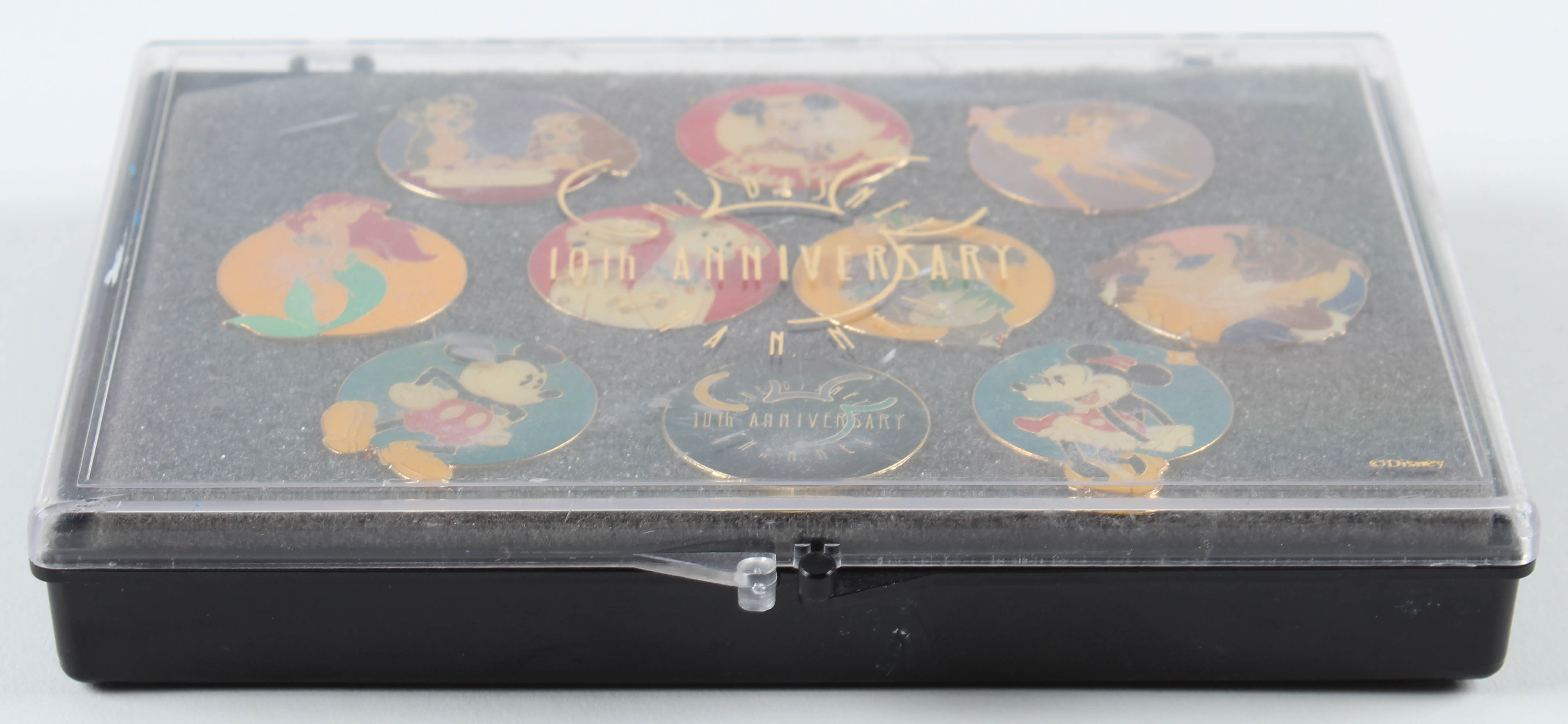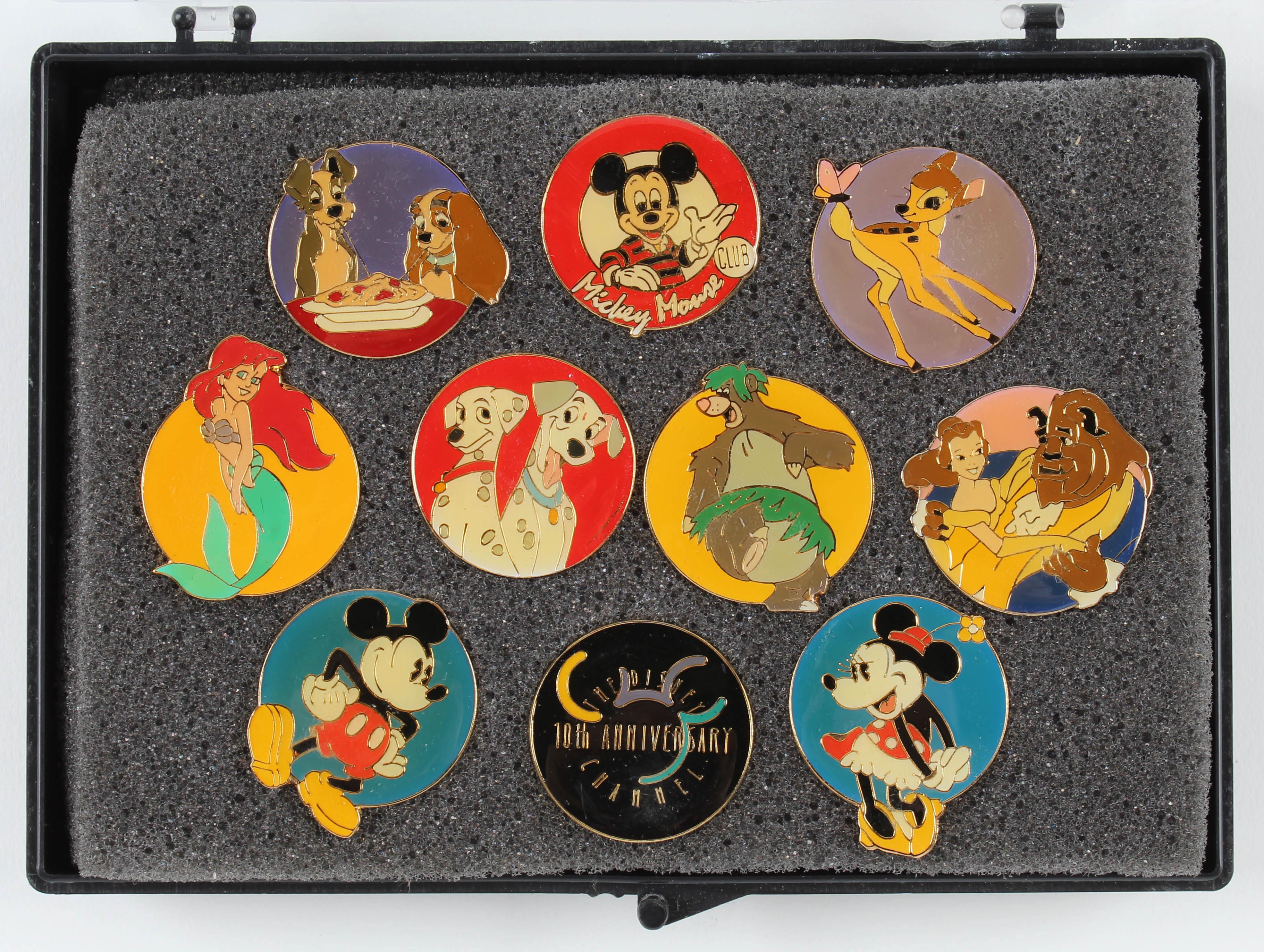Disney Channel 10th Anniversary Pin Set. Includes (10) different commemorative pins. The pins come in the case shown.