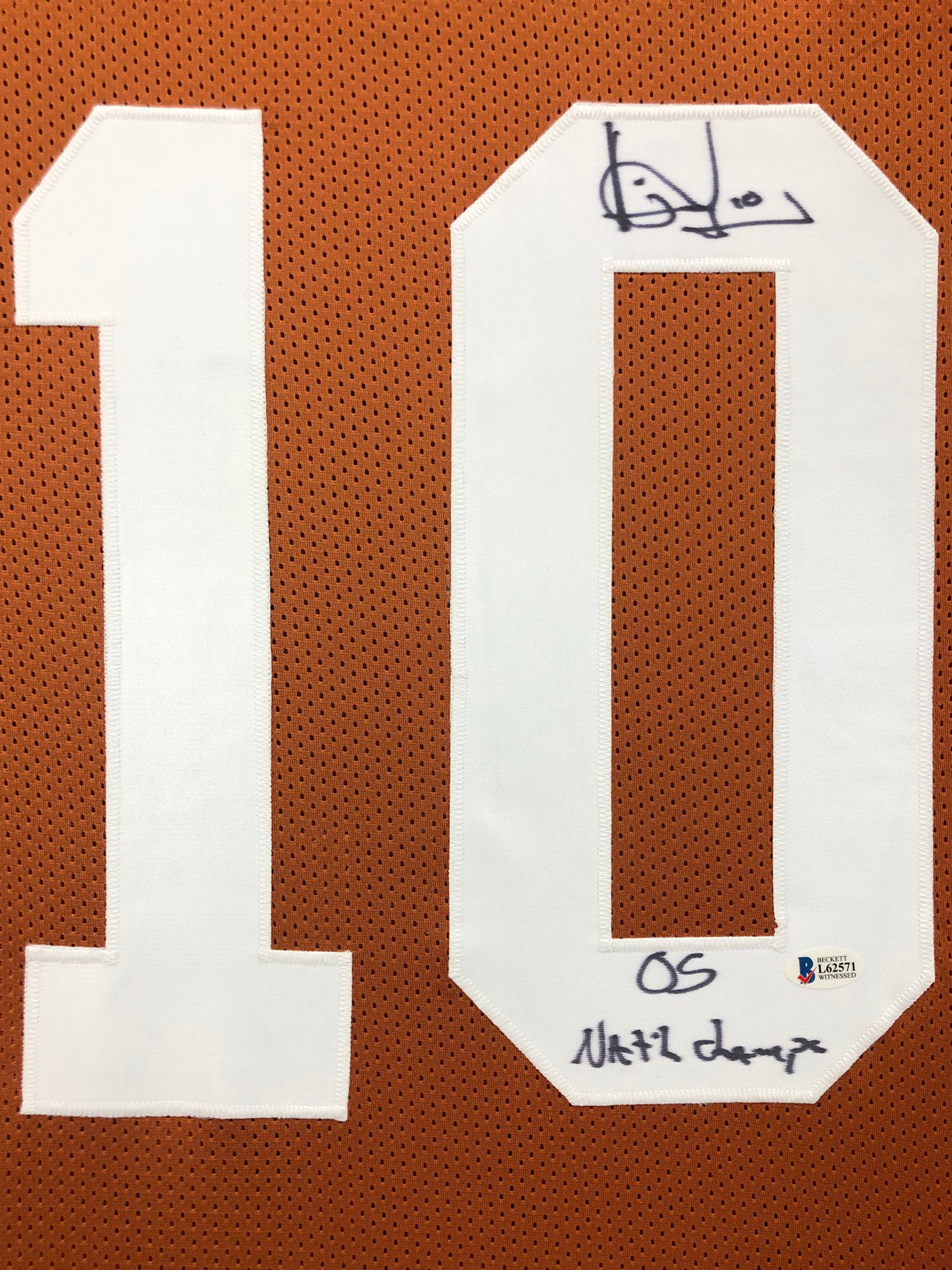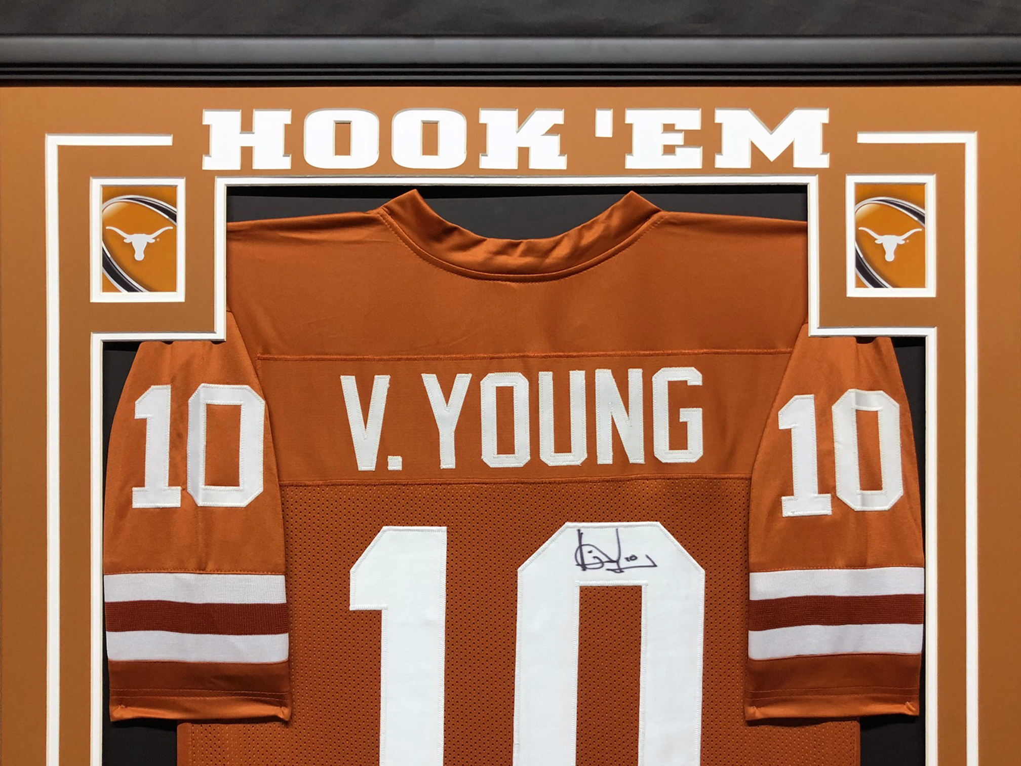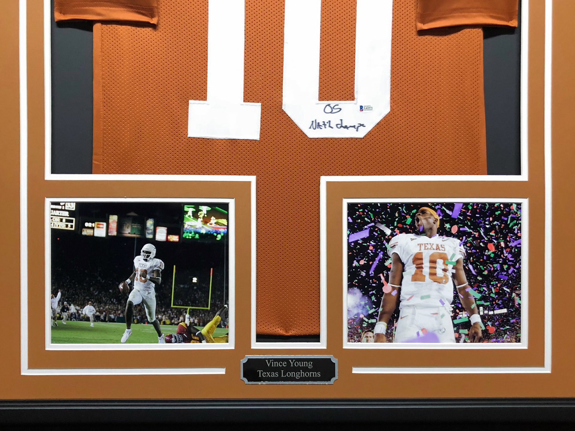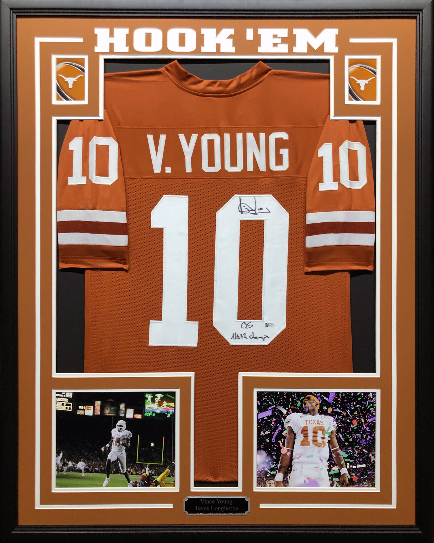 Custom frame measures approximately 34.5" x 42.5" in size and showcases a jersey which has been hand-signed and inscribed "05 Nat'l Champs" by Vince Young. High quality framing includes the following unique features: Jersey is hand-sewn to the back mat board, real wood molding, ultra strong and crystal clear UV-resistant acrylic, (2) licensed logo cards, (2) 8x10 photos, and a double-layer laser-engraved metal nameplate.