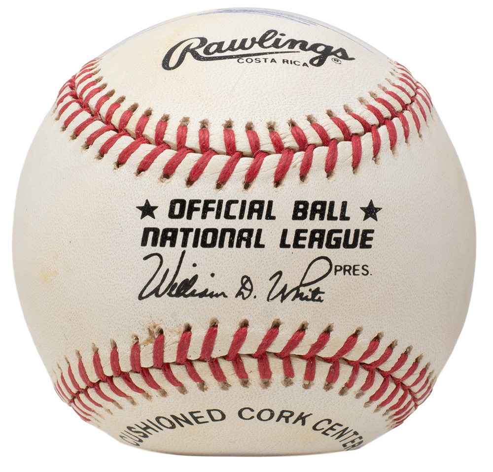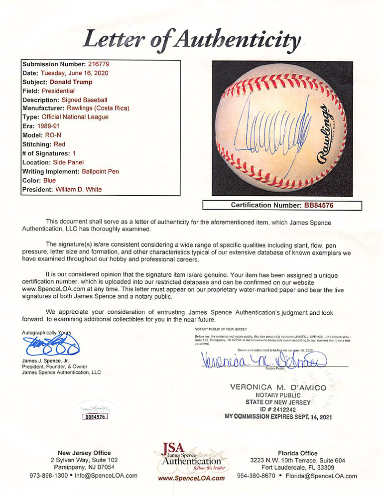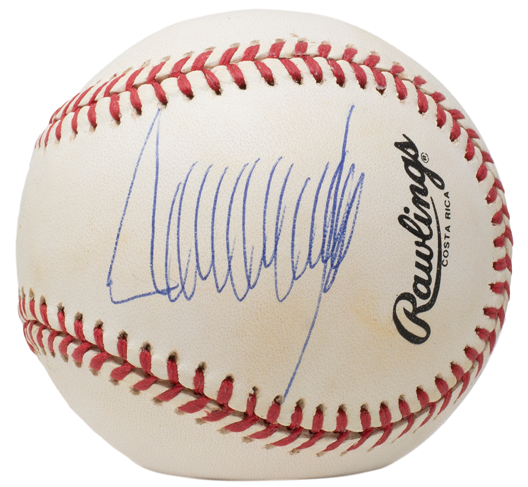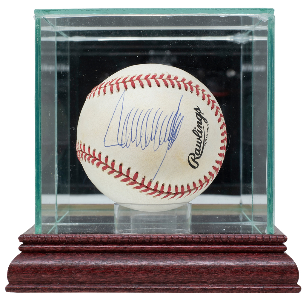 Rawlings Official National League Baseball has been hand-signed by Donald Trump. The baseball shows signs of toning, see photos for details. Display case shown is included.