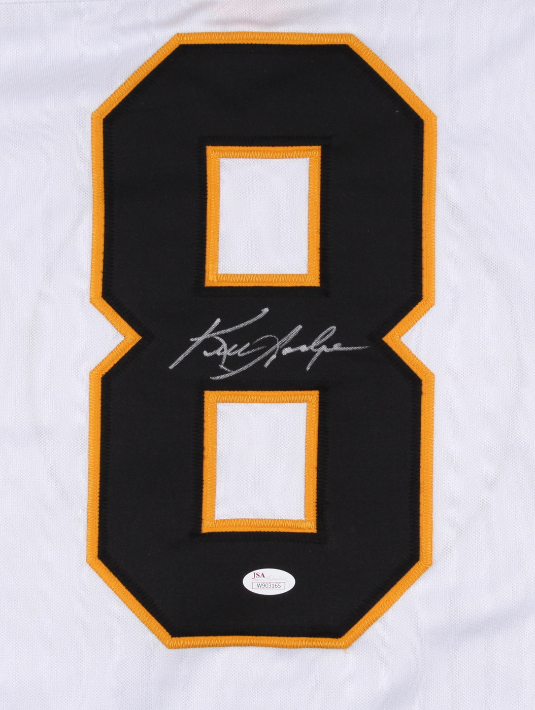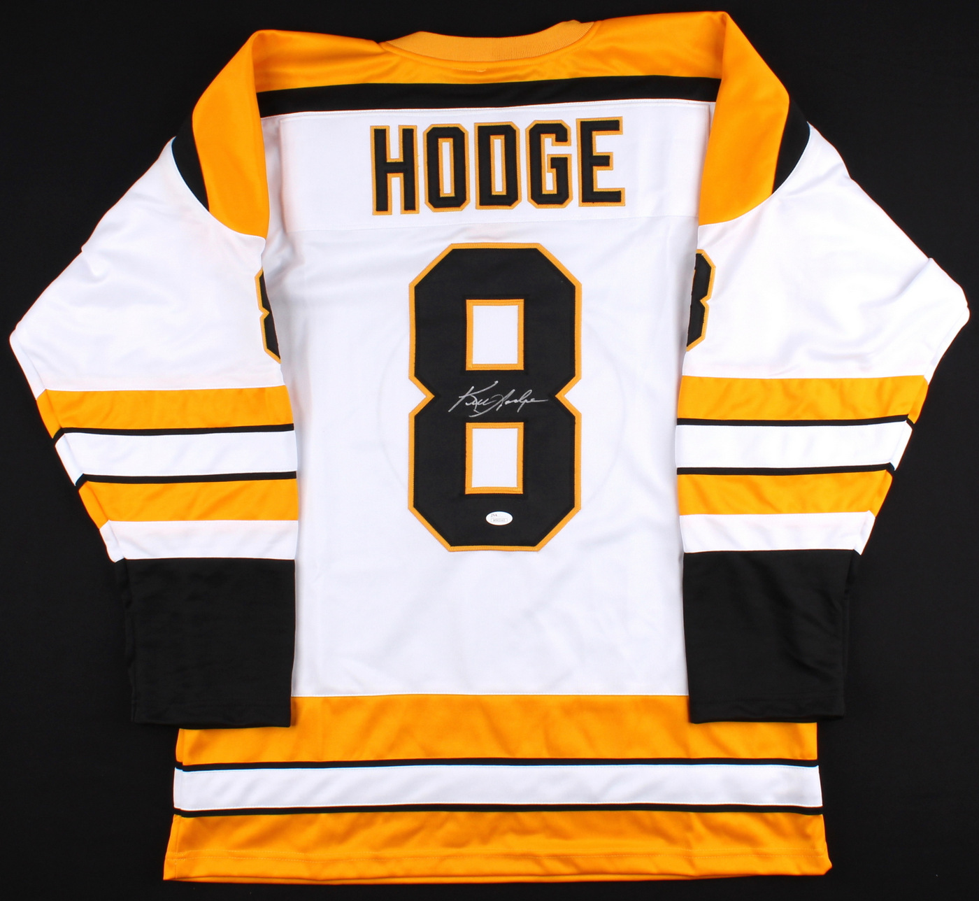Custom on-ice style jersey. Everything is sewn on, size XL. Hand-signed in silver paint pen by Ken Hodge. The autograph includes an official James Spence Authentication (JSA) hologram with matching COA for authenticity purposes. The signing of this item was witnessed by JSA.