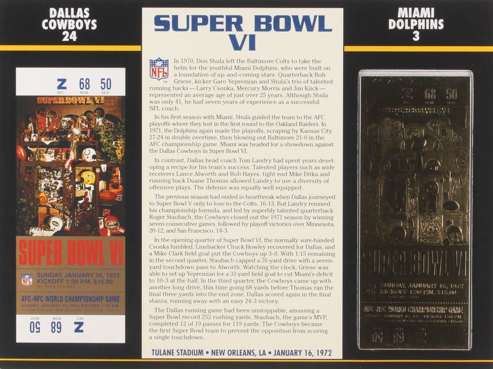 1972 Commemorative Super Bowl VI Card with Ticket: Cowboys vs Dolphins