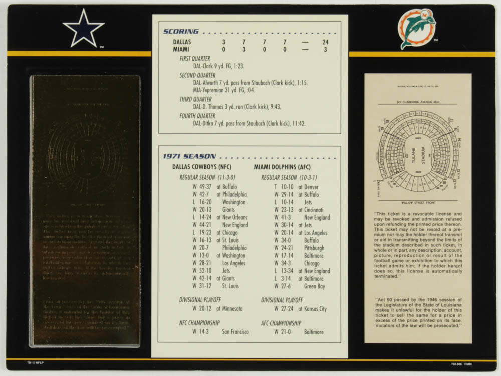 Official scorecard measures 9" x 12" in size with game stats on the reverse side. Features a Dallas Cowboys vs Miami Dolphins replica gold Super Bowl VI ticket.