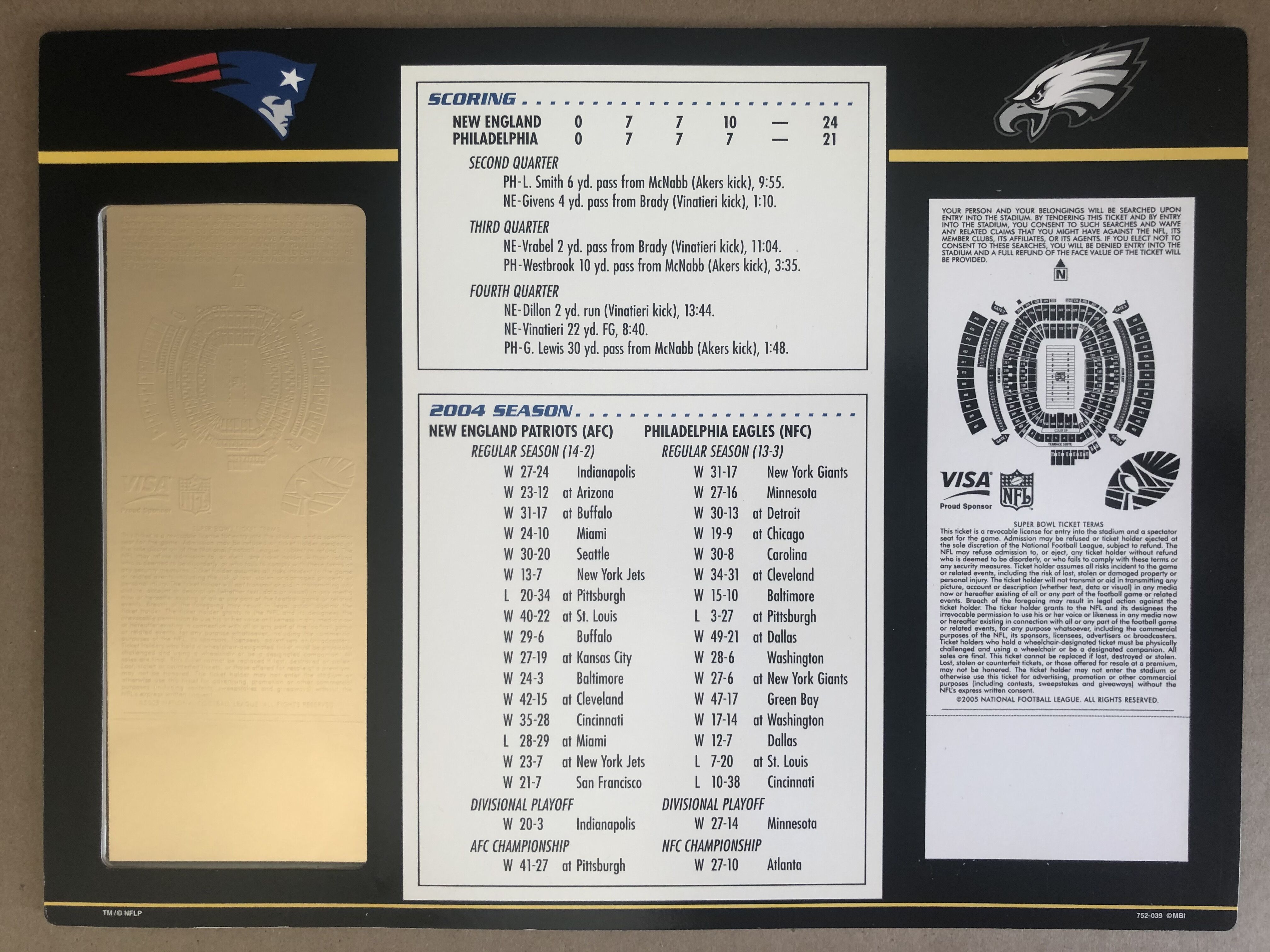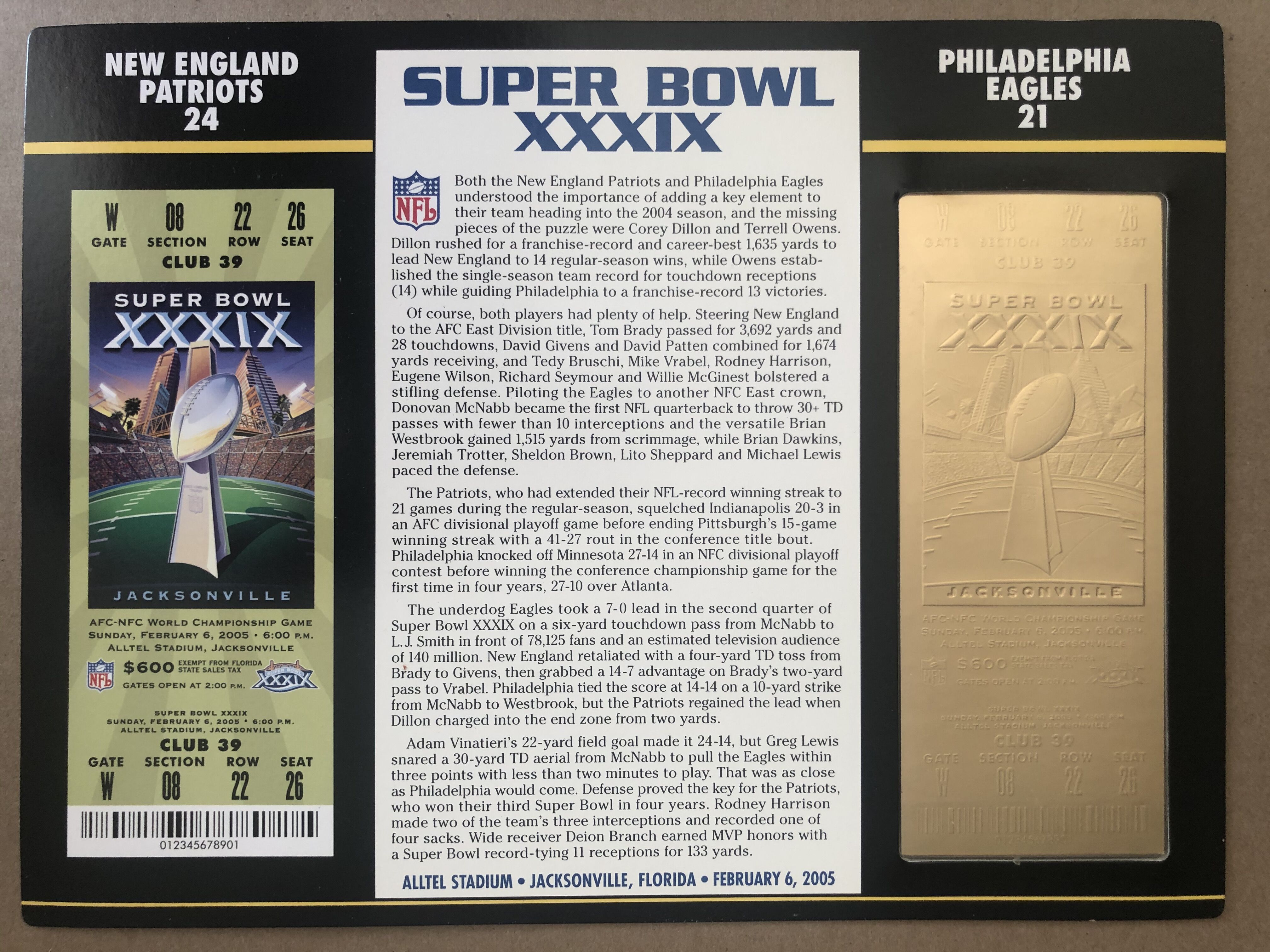 Super Bowl XXXIX Commemorative Score Card with 22kt Gold Ticket
