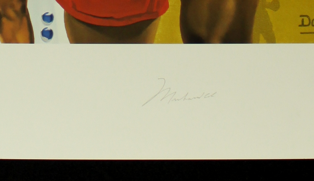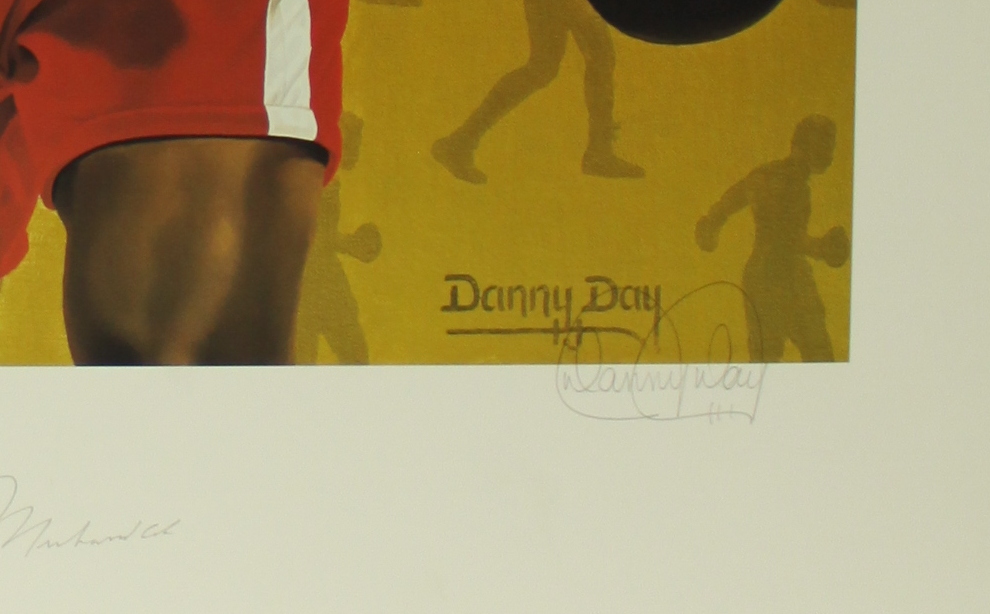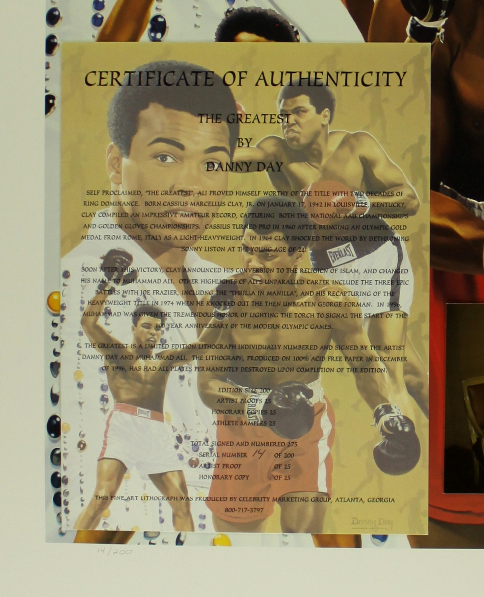 Lithograph is produced on heavy stock archival paper and measures approximately 21 x 29" in size. The piece is hand-signed by Muhammad Ali and artist, Danny Day. The lithograph is limited edition and hand-numbered #14/200. Autograph includes a LOA from Danny Day for authenticity purposes. Also includes an original photograph from the signing.