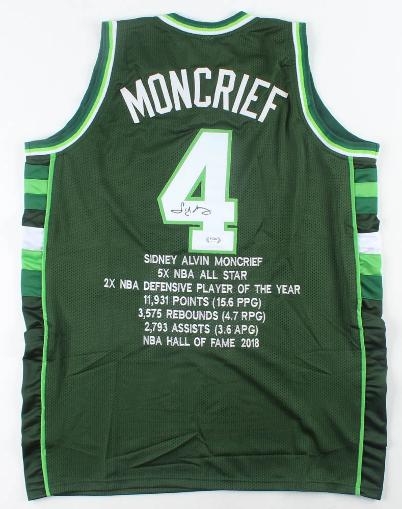 Custom on-court style jersey. Everything is sewn on, size XL. Has been hand-signed by Sidney Moncrief (HOF). Moncrief's career highlights have been custom stitched below the reverse jersey numbers.