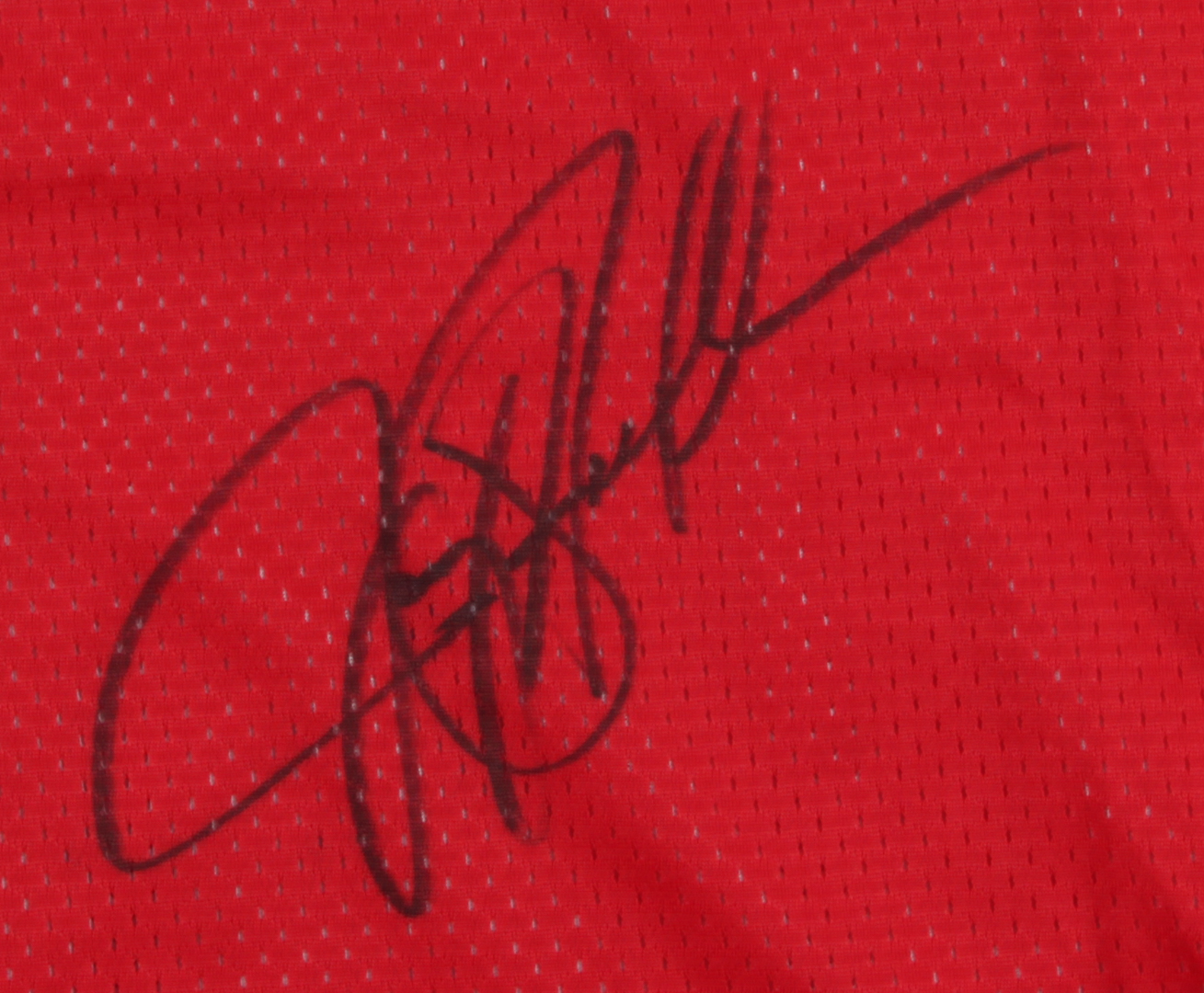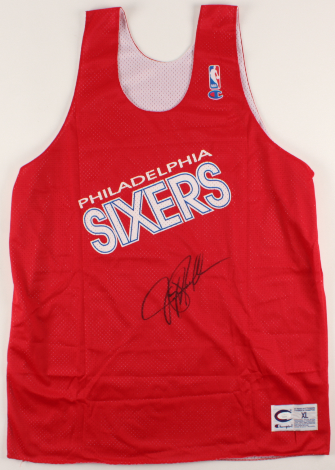 Champion on-court style practice jersey. Everything is sewn on, size L. Has been hand-signed by Jerry Stackhouse (Philadelphia 76ers).