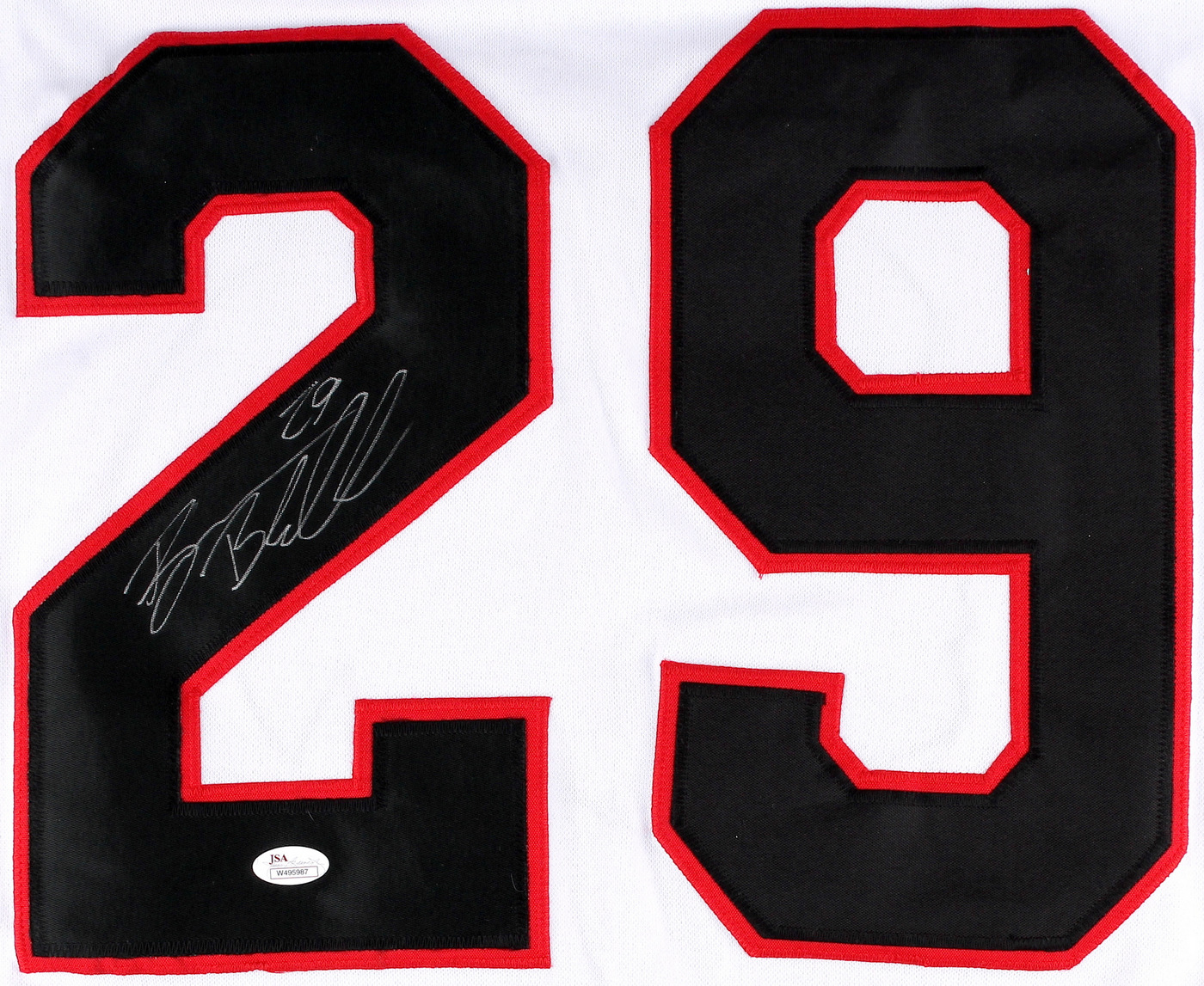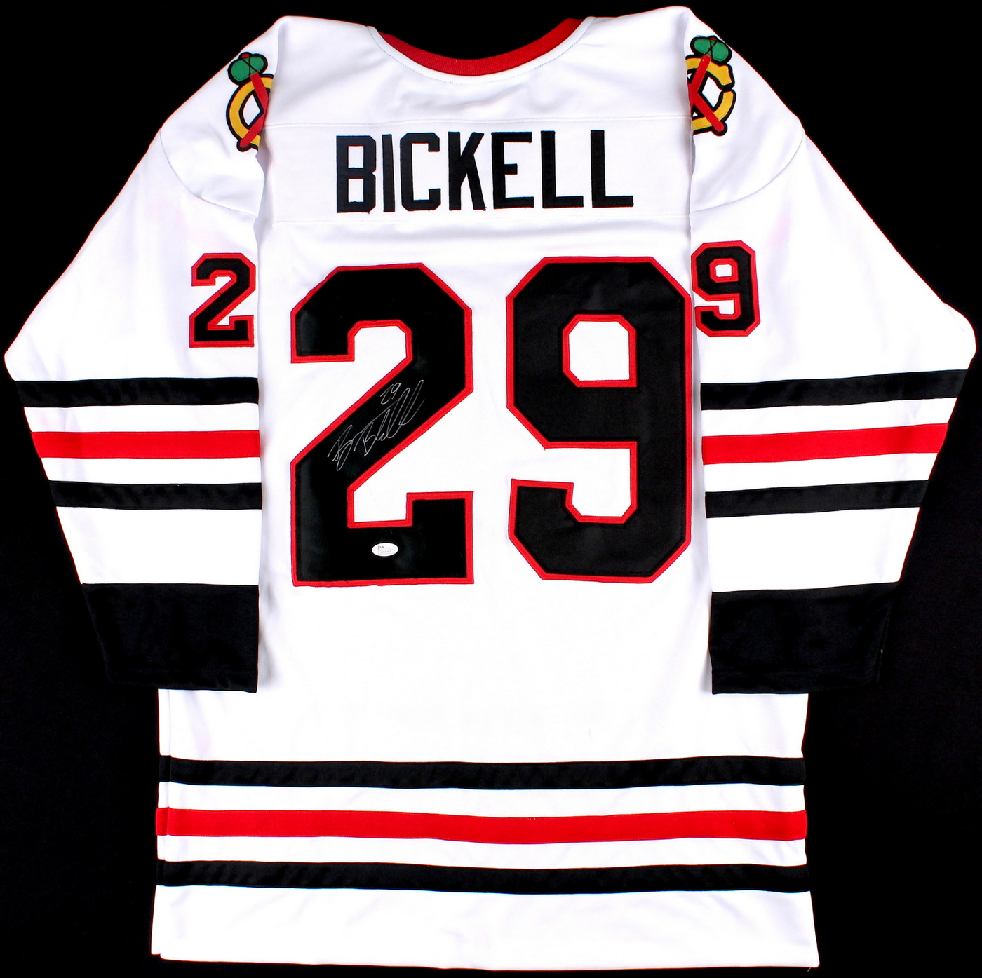 Custom on-ice style jersey. Everything sewn on, size XL. Hand-signed in silver paint pen by Bryan Bickell. The autograph includes an official James Spence Authentication (JSA) hologram and matching COA for authenticity purposes. The signing of this item was witnessed by JSA.