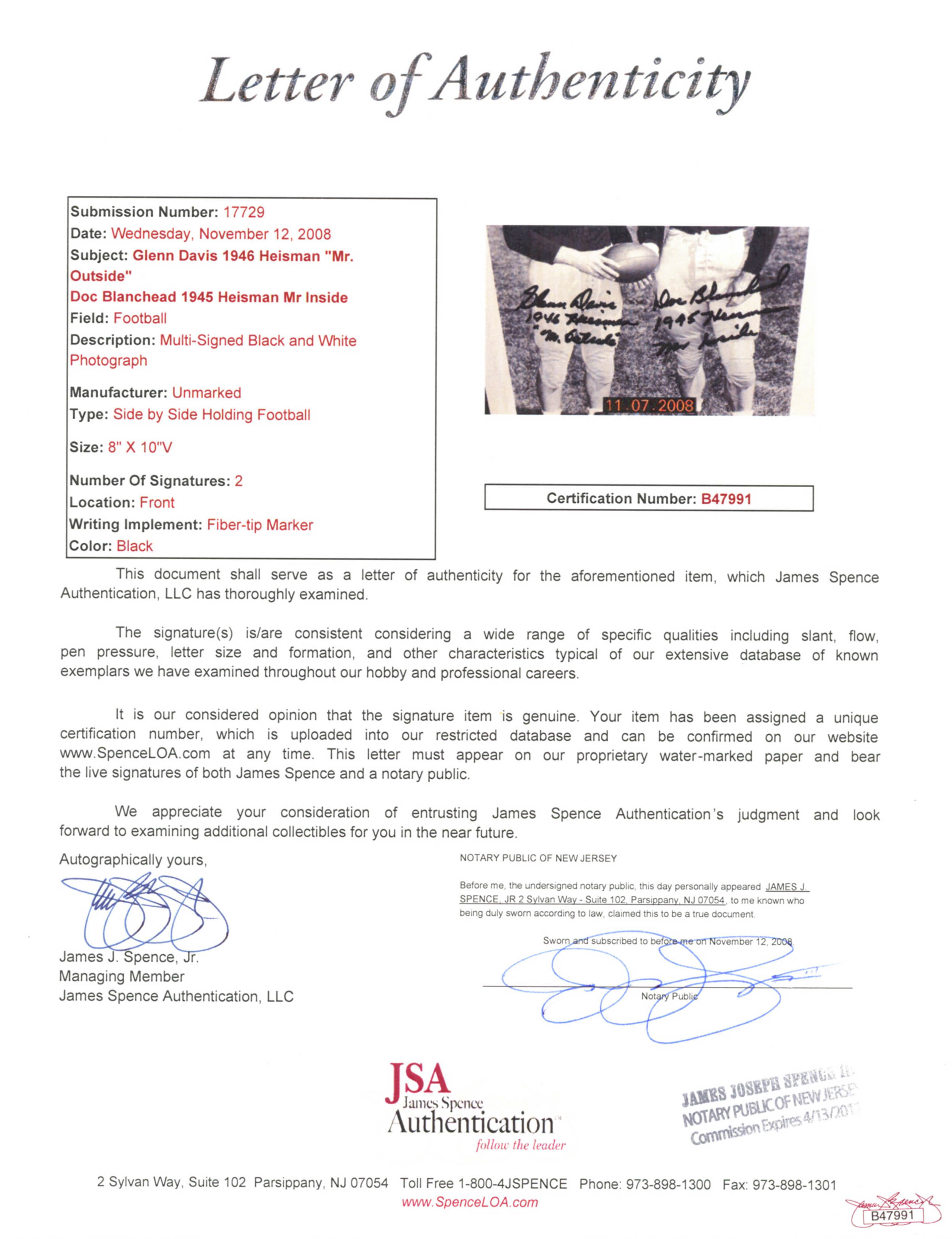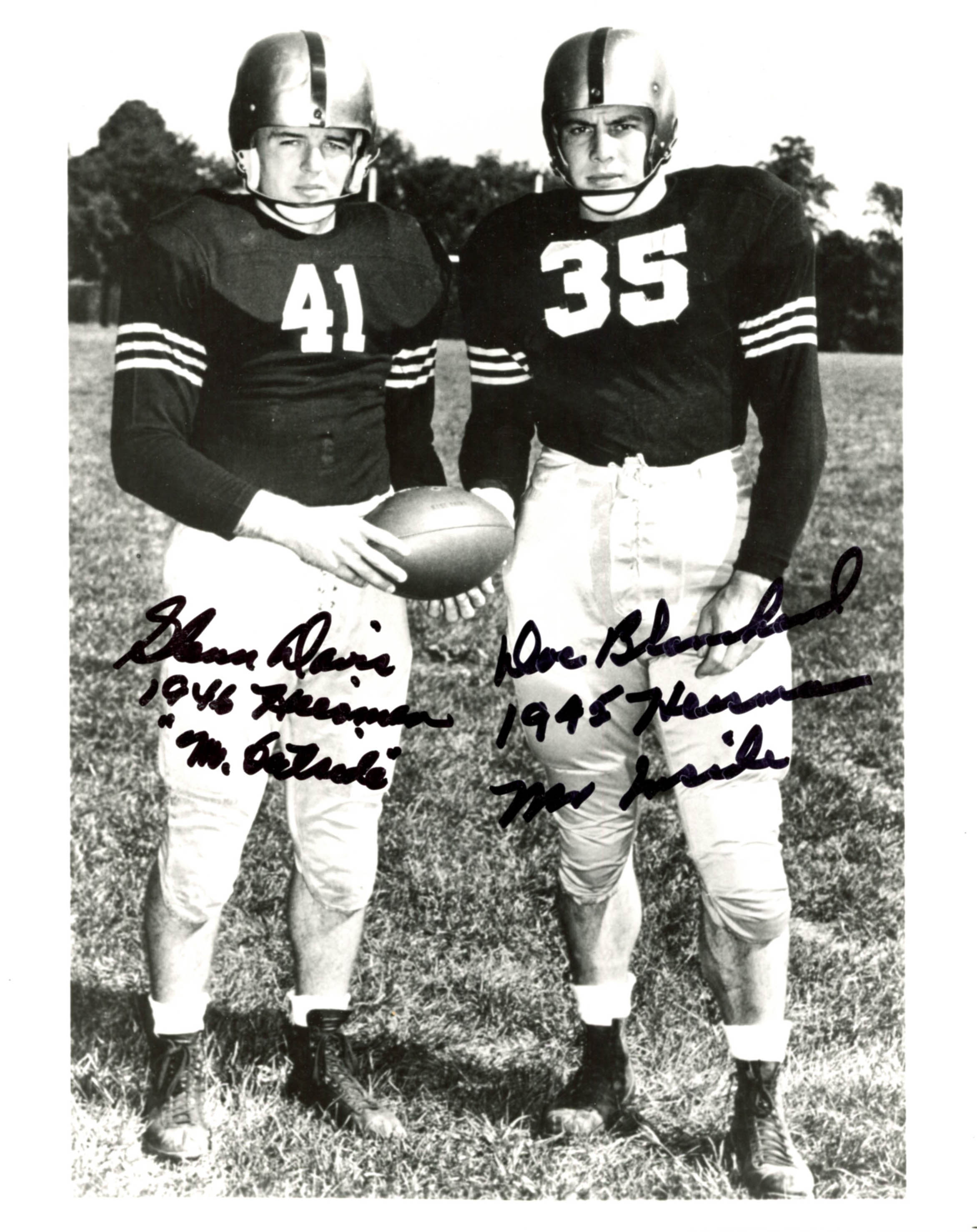 Photo measures 8" x 10" in size and has been hand-signed by Doc Blanchard (D. 2009) and Glenn Davis (D. 2005).