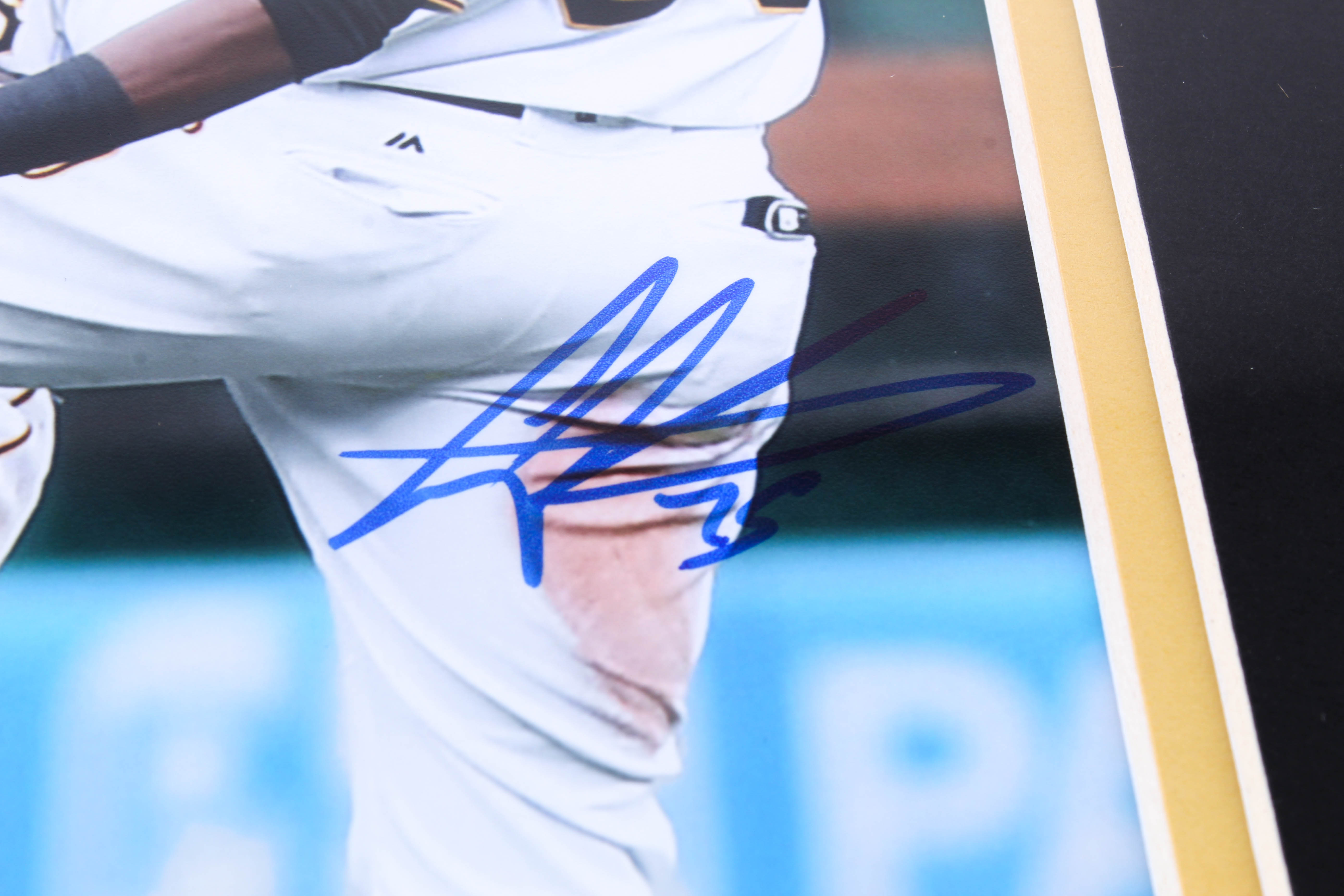 Custom frame measures 13" x 16" in size and features a photo that has been hand-signed by Andrew McCutchen, Starling Marte and Gregory Polanco (Pittsburgh Pirates). Please see photos regarding the condition of the frame.