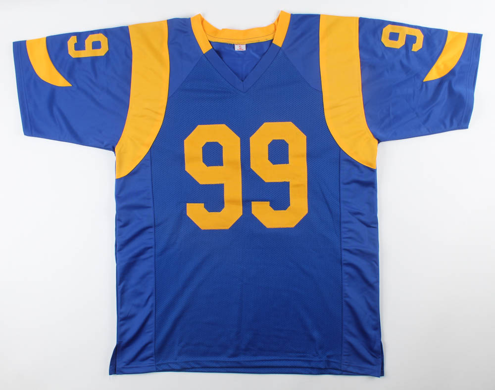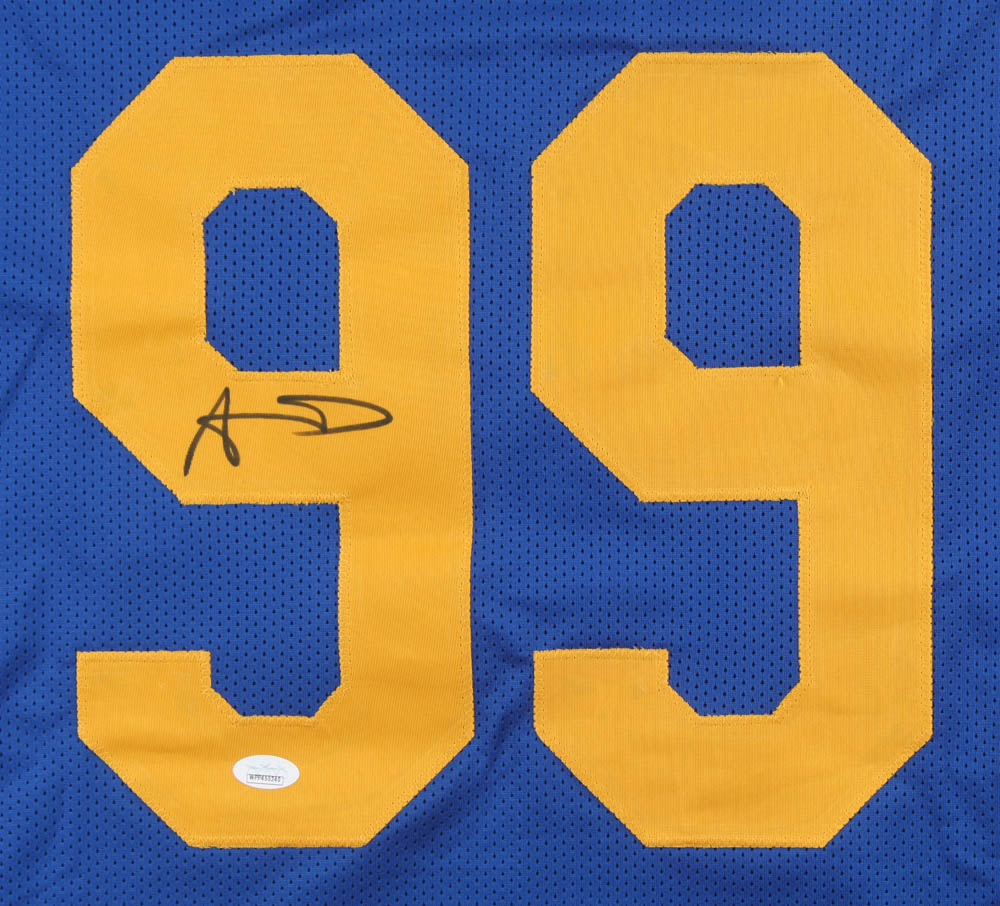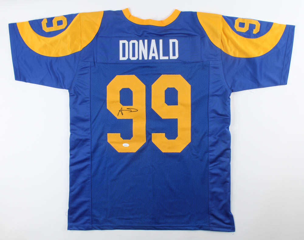Custom on-field style jersey. Everything is sewn on, size XL. Hand-signed by Aaron Donald.