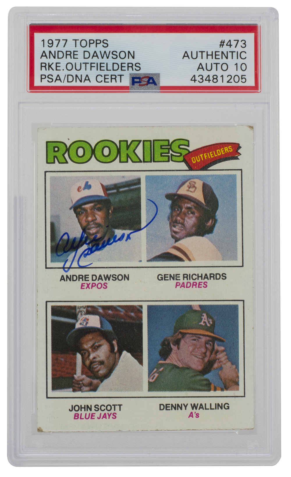 1977 Topps #473 Rookie Outfielders rookie card has been hand-signed by Andre Dawson (Chicago Cubs, HOF).