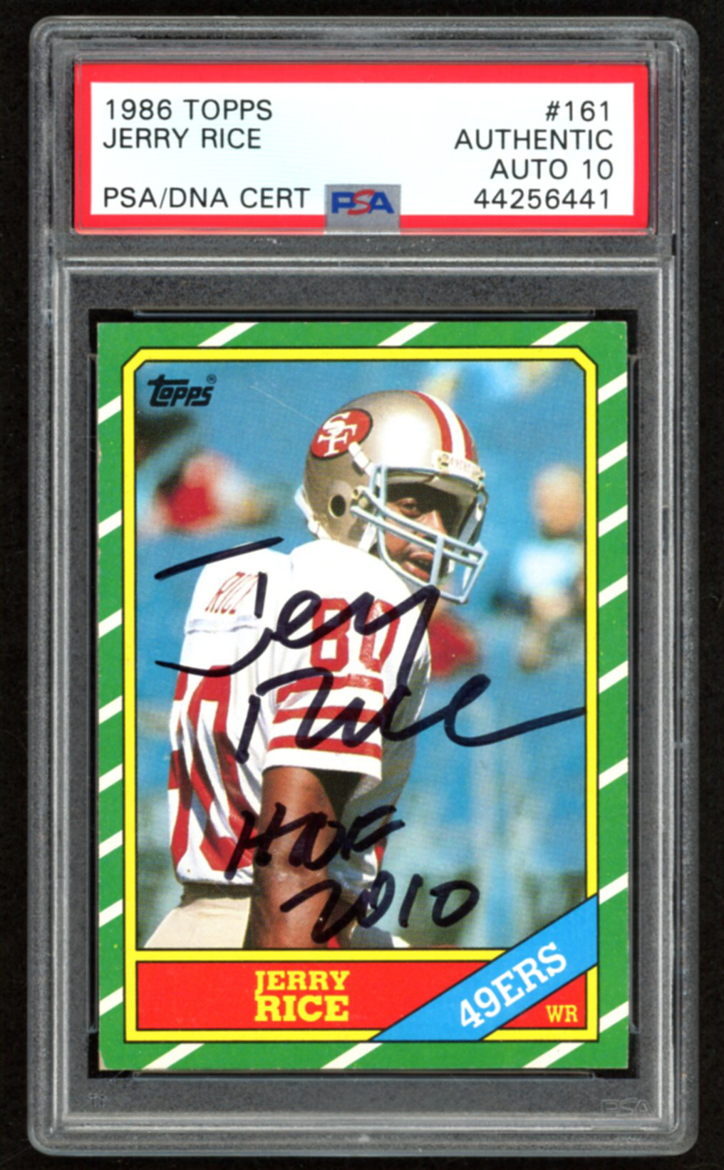 Jerry Rice Signed 1986 Topps #161 RC Inscribed "HOF 2010" (PSA Encapsulated Auto 10)
