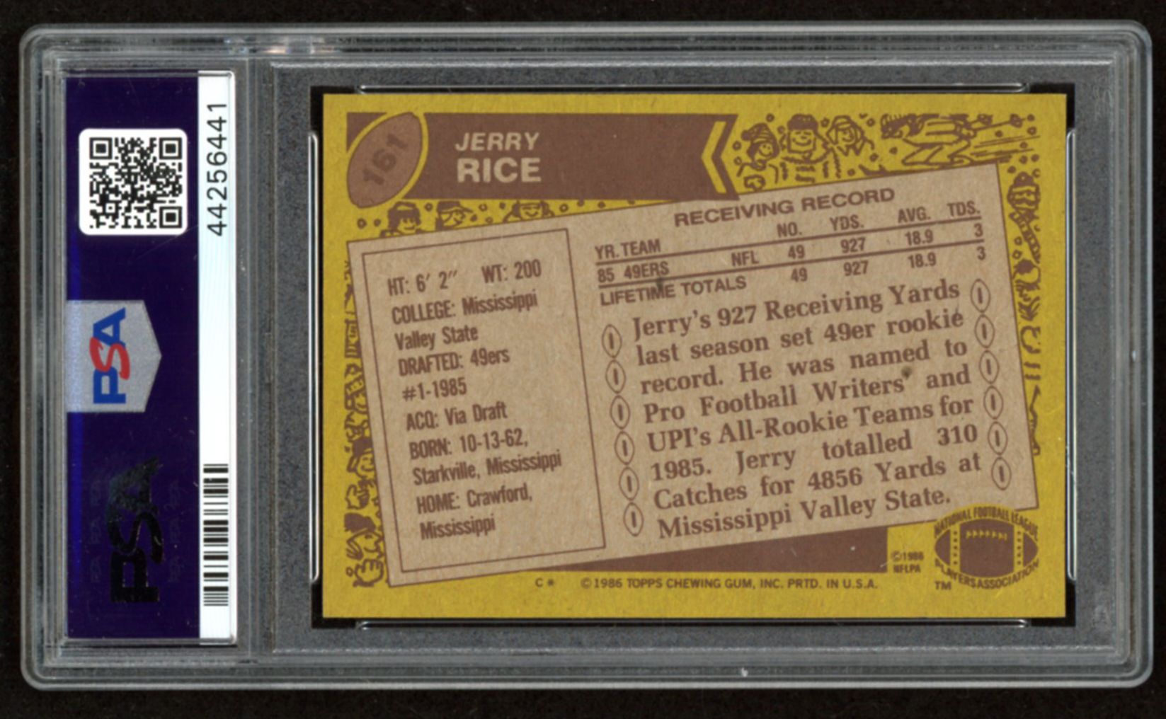 1986 Topps #161 RC has been hand-signed by Jerry Rice (San Francisco 49ers, HOF).