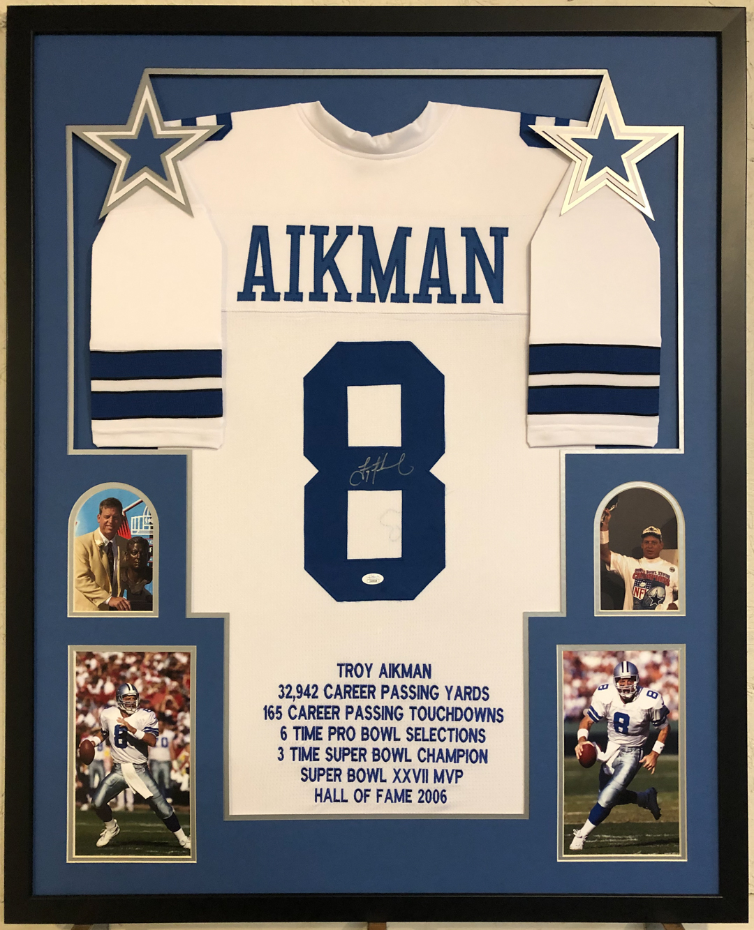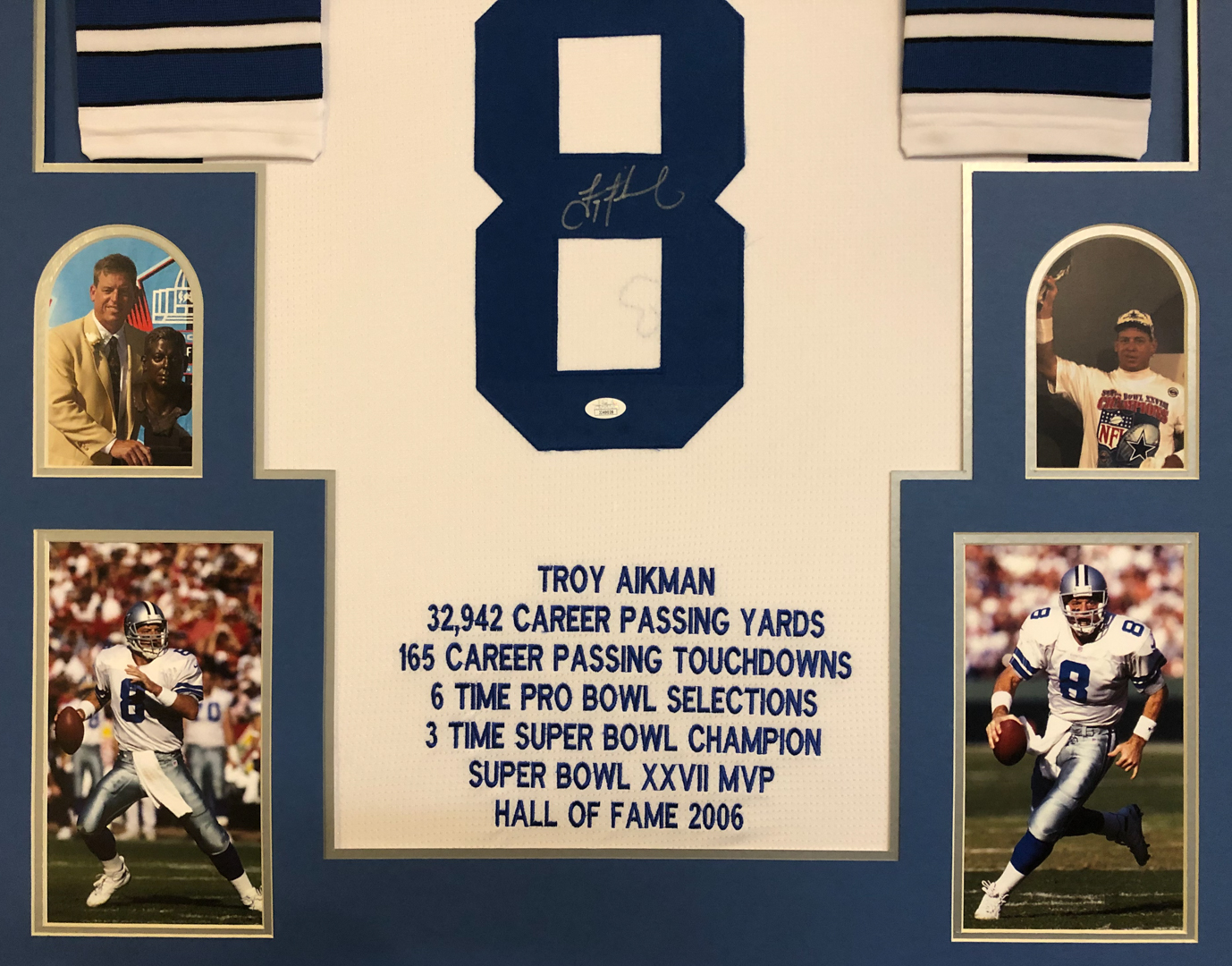 Custom frame measures 34" x 42" in size. Features a jersey that has been hand-signed by Troy Aikman (HOF). Aikman's career highlights have been custom stitched below the reverse numbers.