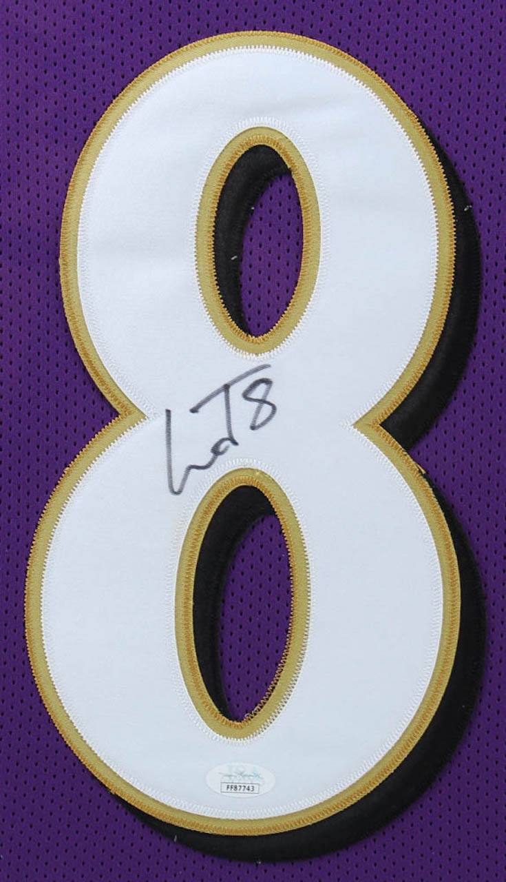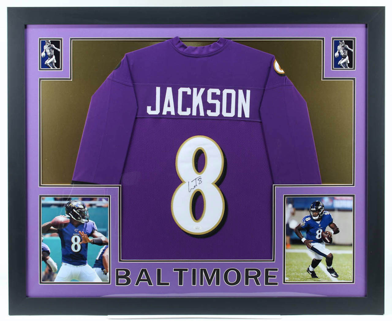 Custom framed display measures 35" x 43" in size and features a jersey that has been hand-signed by Lamar Jackson. Please see photos for details regarding the condition of the frame.
