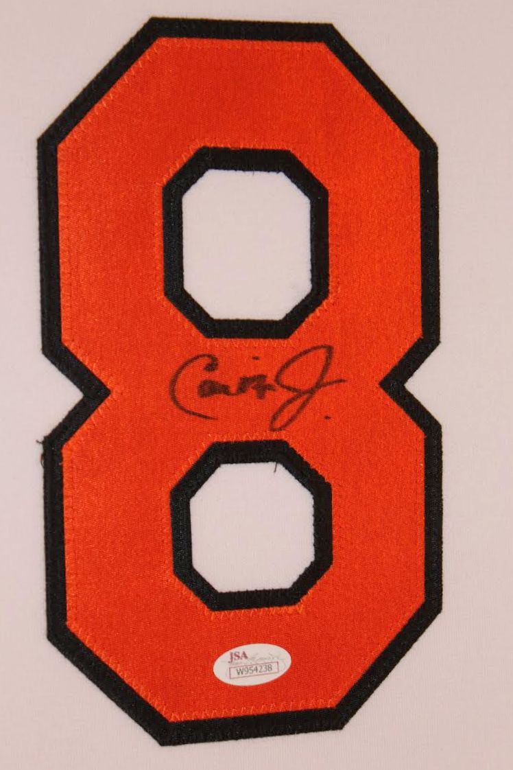 Custom frame measures approximately 35" x 43" in size and features a jersey which has been hand-signed in black felt-tip pen by Cal Ripken Jr. The autograph includes an official James Spence Authentication (JSA) hologram with matching COA for authenticity purposes. The signing of this item was witnessed by JSA.