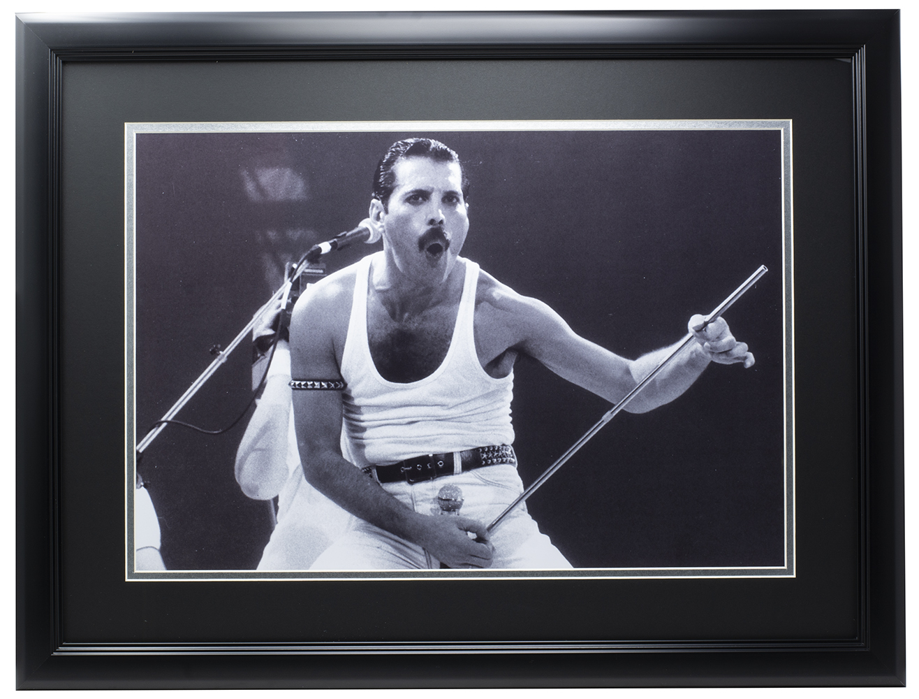 Custom frame measures approximately 18" x 25" in size and features a photo of Freddie Mercury (D. 1991). Please note, the photo is unsigned.