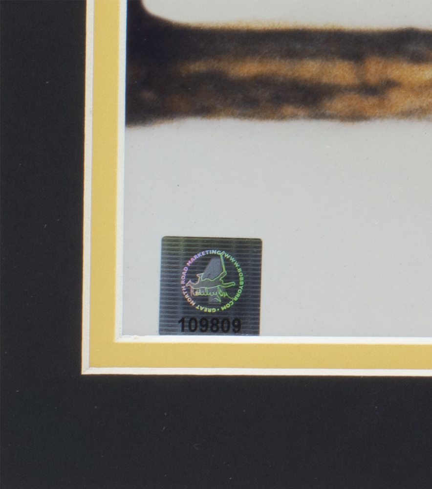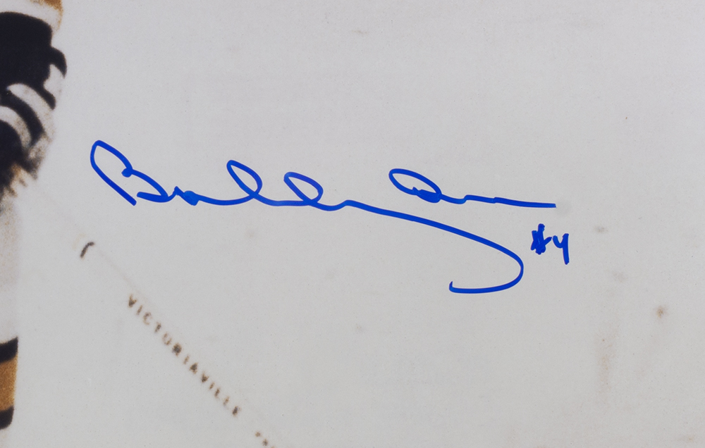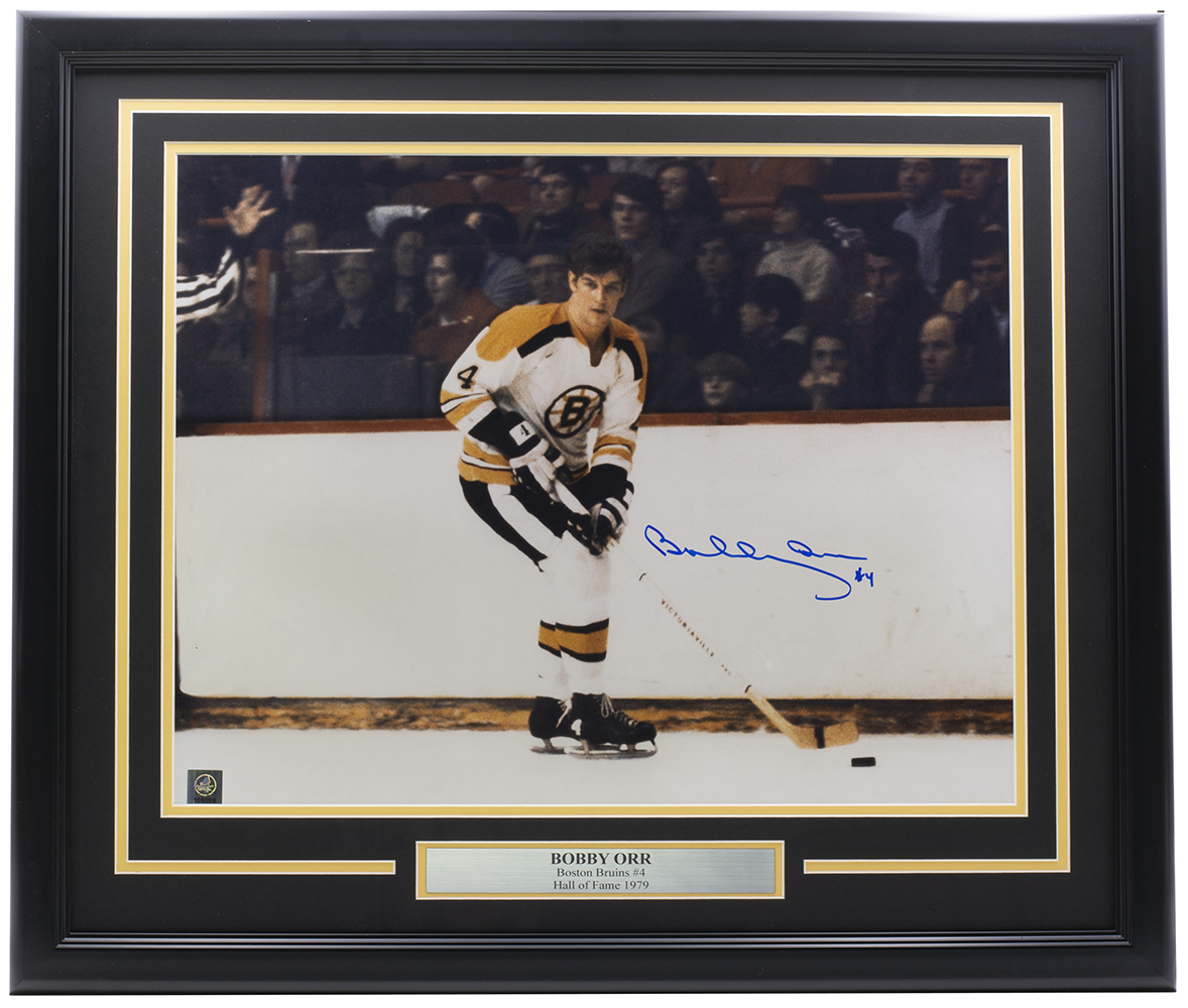 Custom framed display measures approximately 22" x 27" in size and has been hand signed by Bobby Orr (Boston Bruins, HOF). Orr was a defenseman and one of the greatest players to ever play in the NHL. He won eight consecutive Norris Trophies (best defenseman), three consecutive Hart Trophies (league MVP), and was inducted into the Hall of Fame when he was only 31 years old.