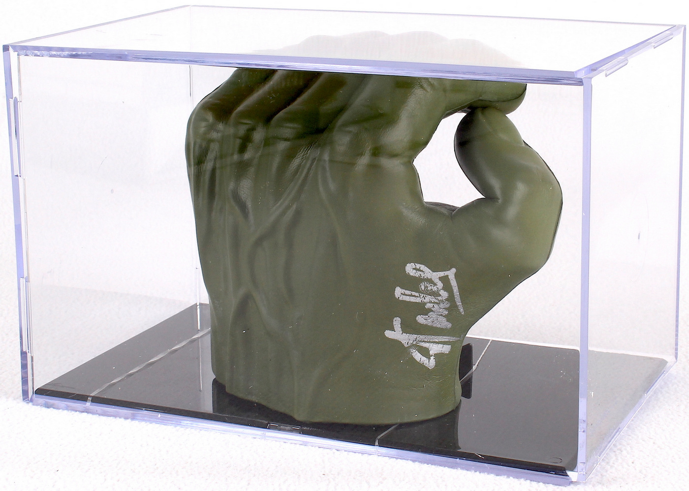 The Incredible Hulk fist. Hand-signed in silver paint pen by Stan Lee. Includes the display case as shown. Please note that the case is slightly damaged, see photos for more details. The autograph includes an official PSA/DNA hologram and matching LOA for authenticity purposes.