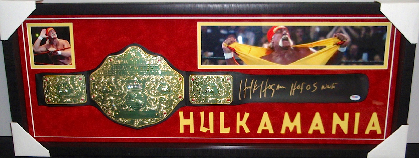 Shadowbox display measures approximately 15 " x 39 " in size and features a wrestling belt which has been hand-signed in gold metallic paint pen by Hulk Hogan. The autograph includes an official PSA/DNA hologram and matching COA for authenticity purposes. The signing of this item was witnessed by PSA.