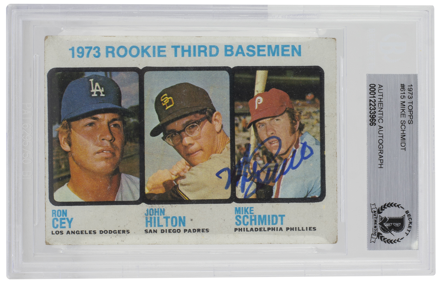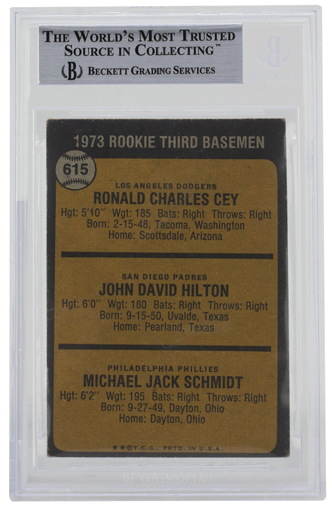 Mike Schmidt Signed 1973 Topps #615 Rookie Third Basemen / John Hilton RC / Ron Cey RC / Mike Schmidt RC (BGS Encapsulated)