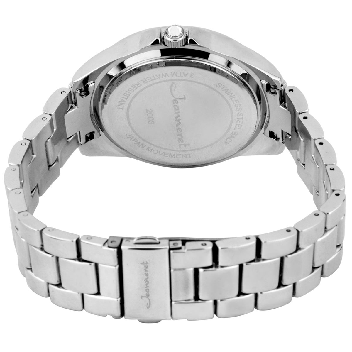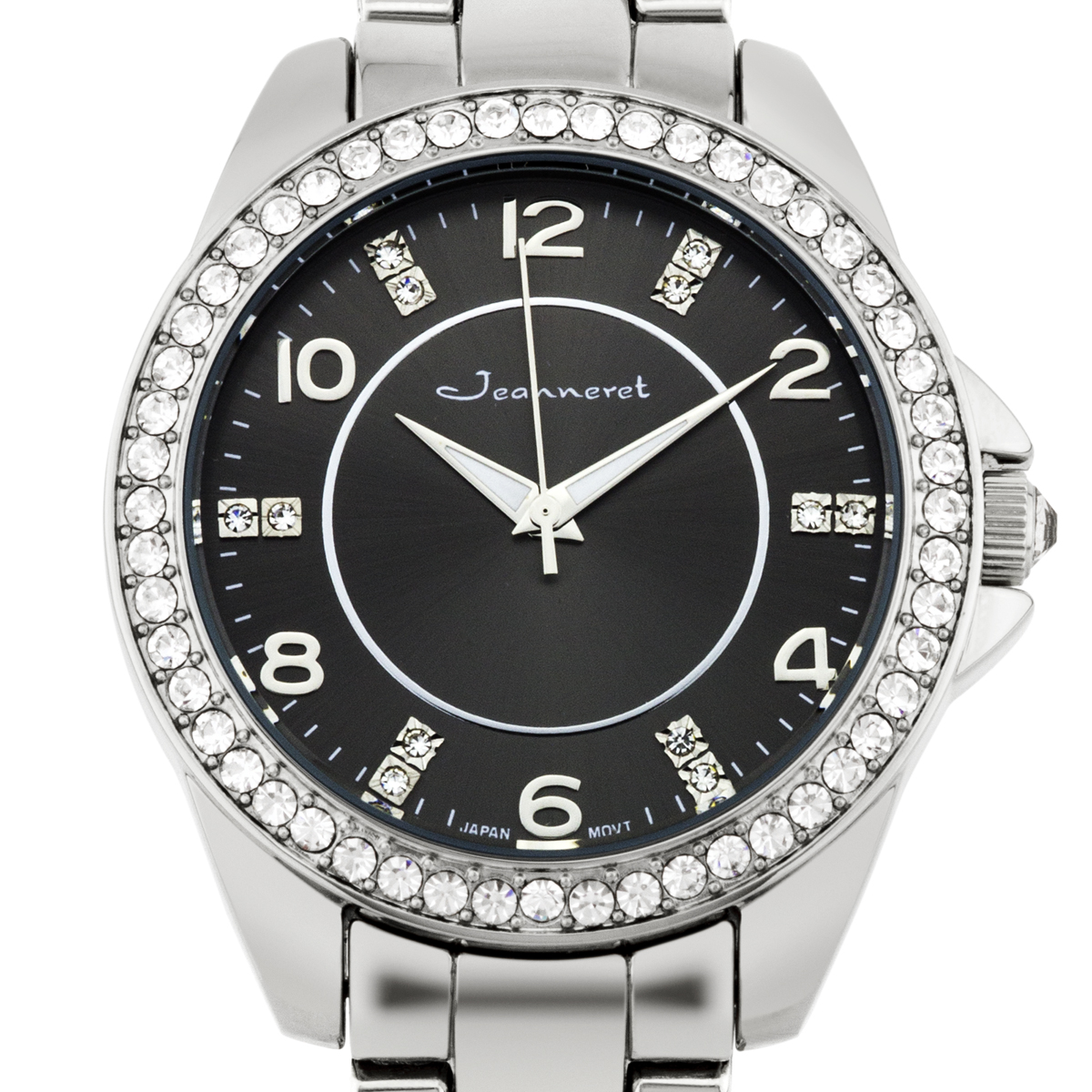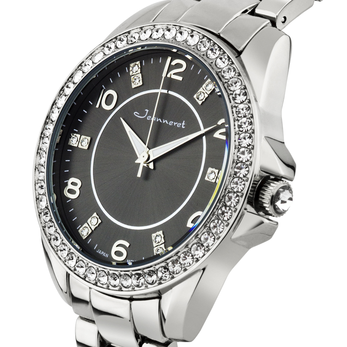 The Jeanneret Rosetta II Ladies Watch features a silver bracelet, silver case, cubic zirconia stone bezel, gun metal dial, and silver indexes. Please see photos for more details.