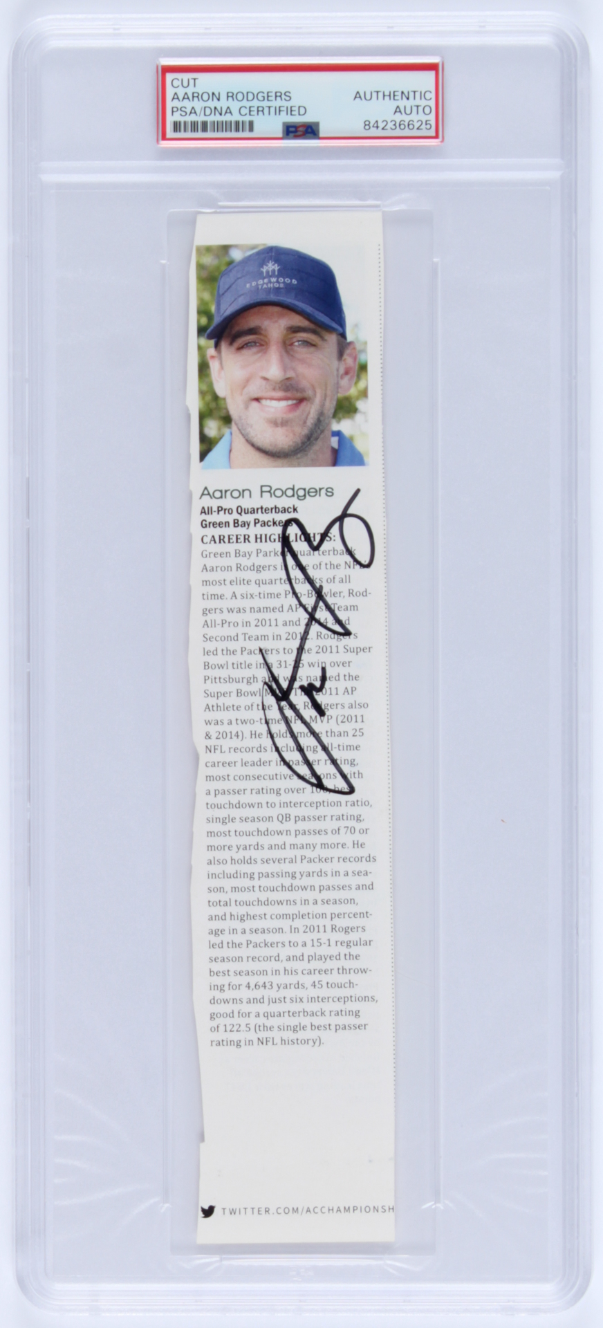 Cut measures approximately 2" x 10" in size and has been hand-signed by Aaron Rodgers (Green Bay Packers).