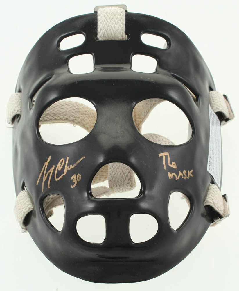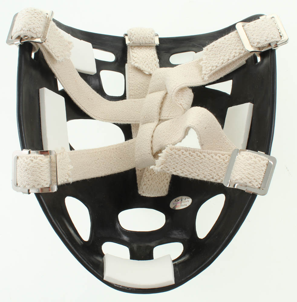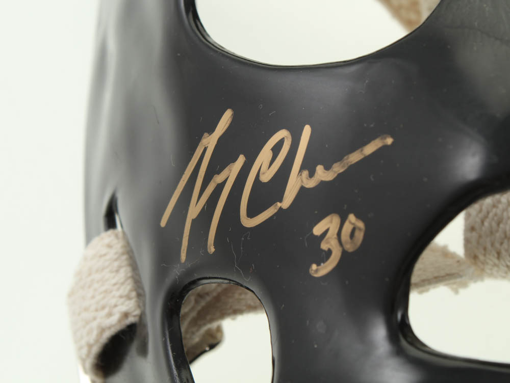Full-size throwback goalie mask. Hand-signed by Gerry Cheevers (Boston Bruins, HOF).