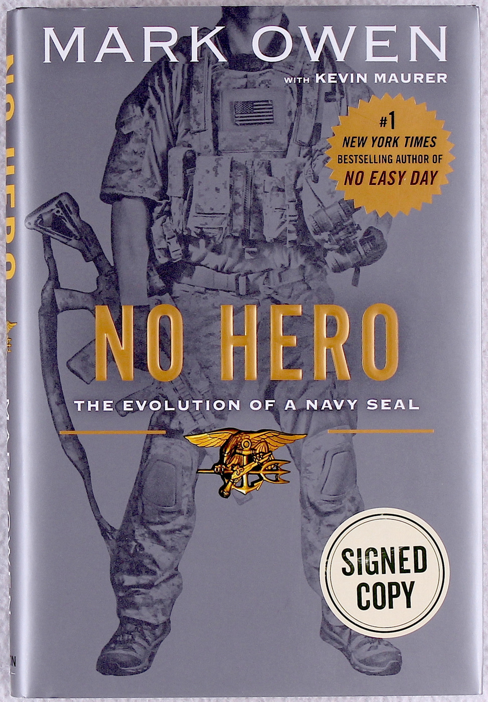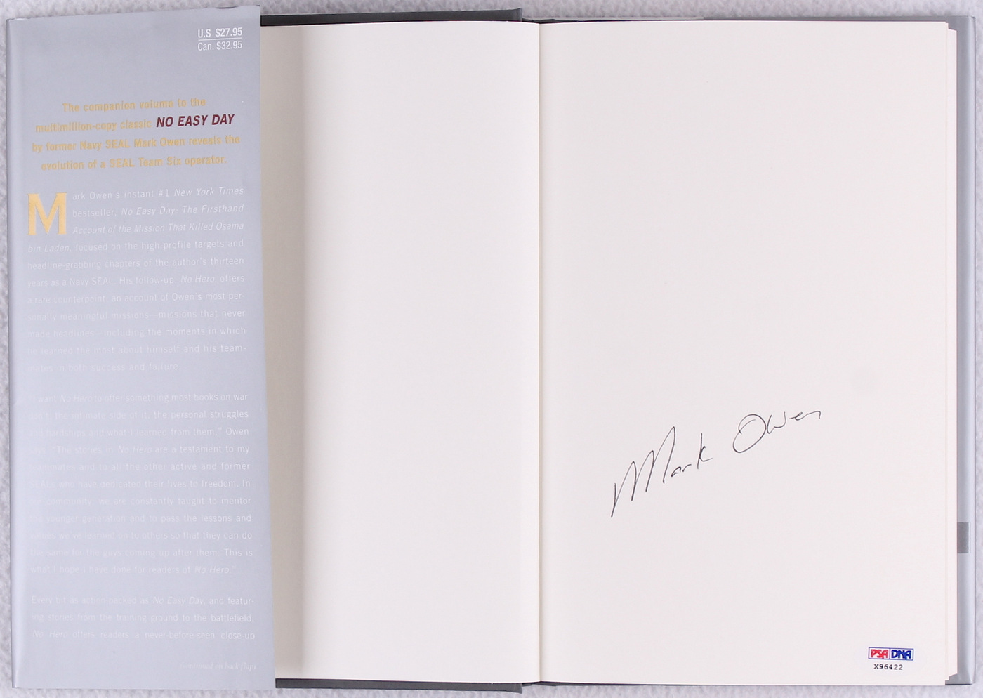 "No Hero" hardcover book. Hand-signed in black ink pen by Mark Owen (Seal Team 6). Owen was a team leader on the May 1st, 2011 mission that lead to the death of Osama bin Laden. The autograph includes an official PSA/DNA hologram and matching COA for authenticity purposes.