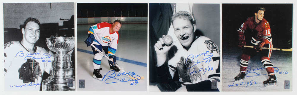 Lot includes all (4) photos shown. Photos measure 8" x 10" in size and have been hand-signed and inscribed by Bobby Hull (Chicago Blackhawks, HOF).